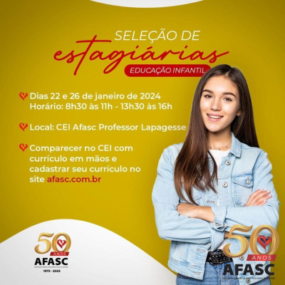 A Associação Feminina de Assistência Social de Criciúma (Afasc) informa que abrirá uma nova oportunidade para estudantes interessadas em integrar a equipe dos Centros de Educação Infantil (CEIs). Será realizada no CEI Professor Lapagesse, mais uma seleção de estagiárias nesta sexta-feira (26), das 8h30 às 11h e das 13h30 às 16h.