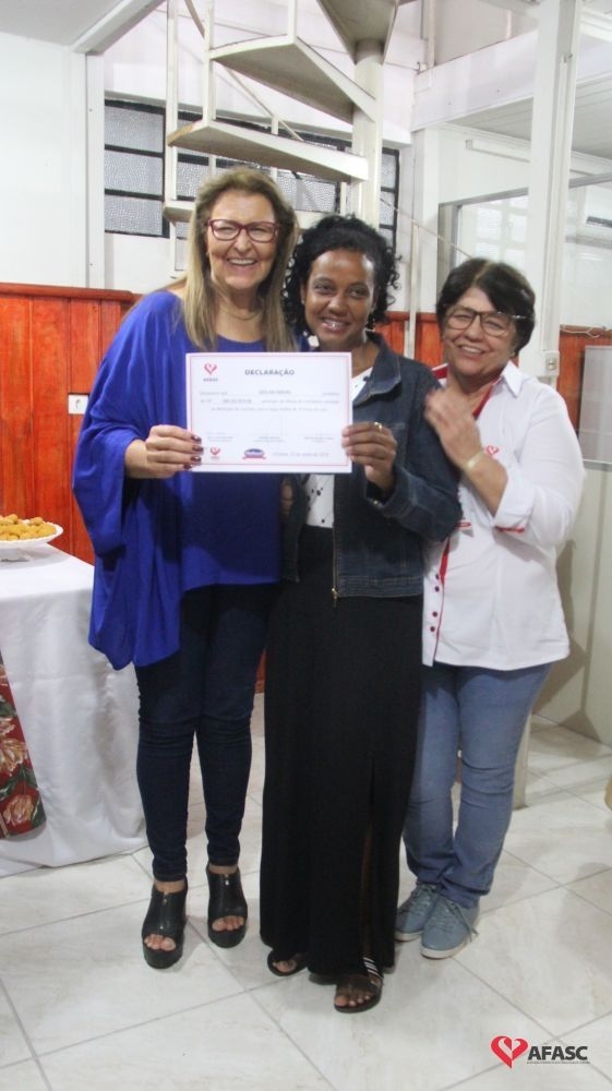 Um grupo de sete mulheres atendidas pela Associação Feminina de Assistência Social de Criciúma (Afasc) por meio de departamento da Afasc Solidária, tiveram uma grande conquista no fim da tarde desta terça-feira (25). Depois de aproximadamente um mês de curso, as participantes da oficina de confeitaria, que foi realizado em parceria entre instituição e a Loja Mathesch, receberam sua declaração de conclusão de curso, o que as deixa aptas para entrarem no mercado de trabalho.