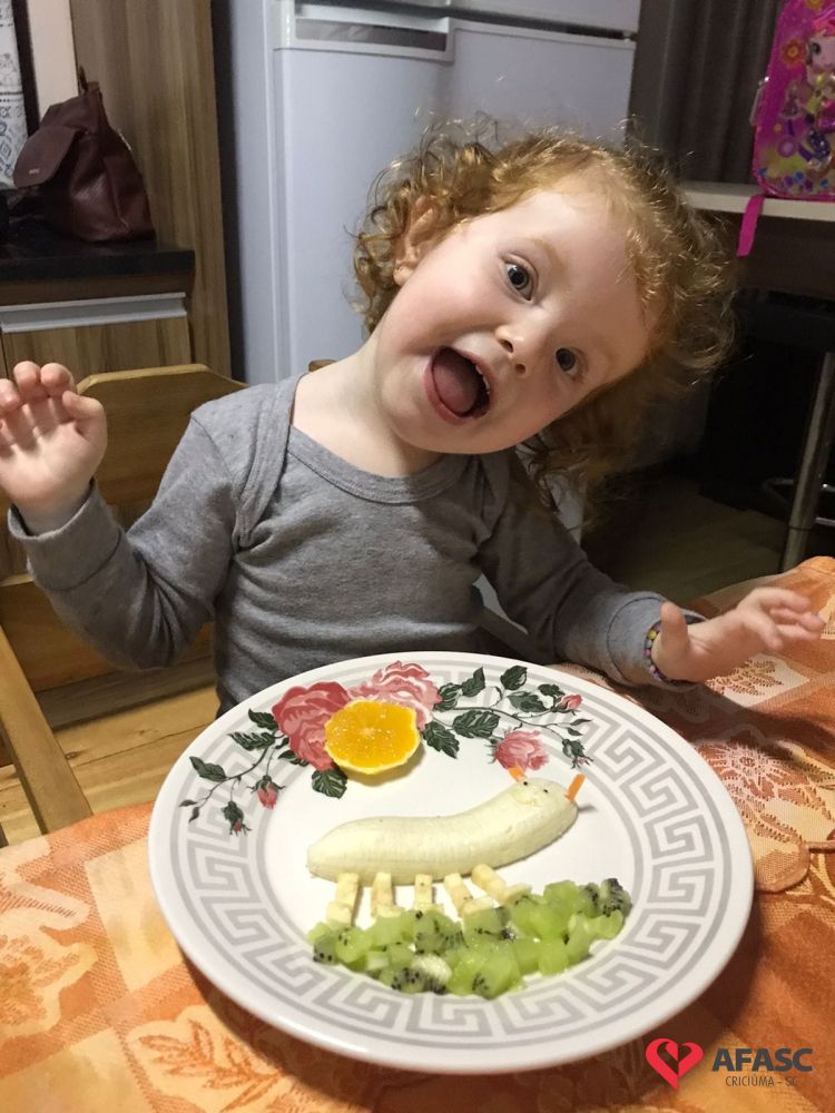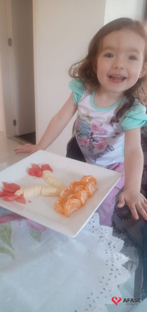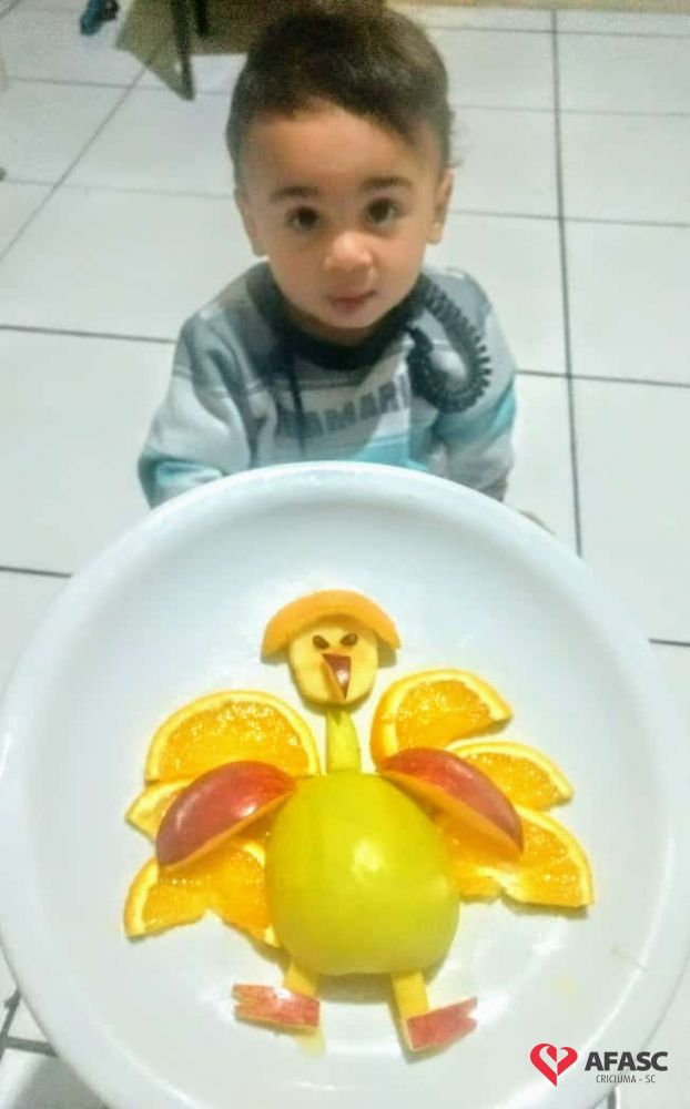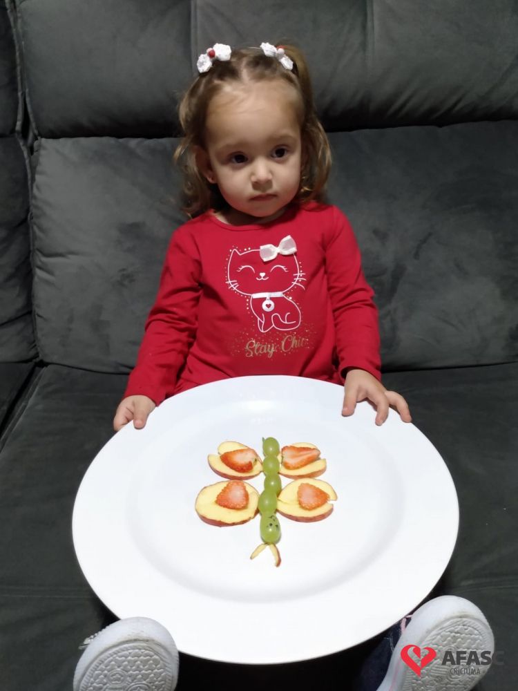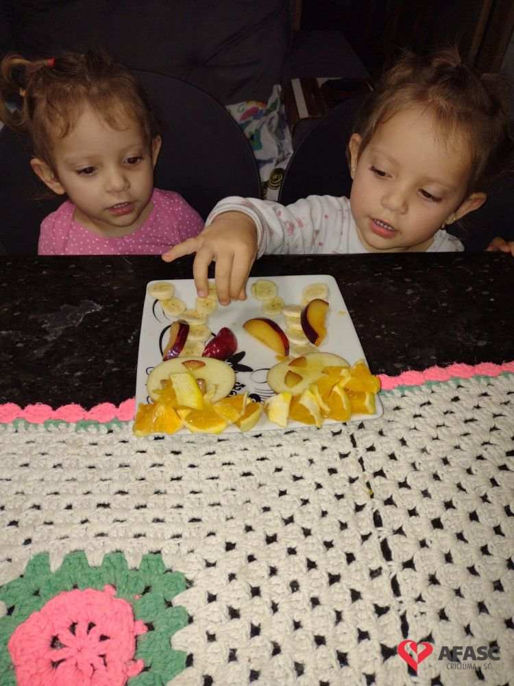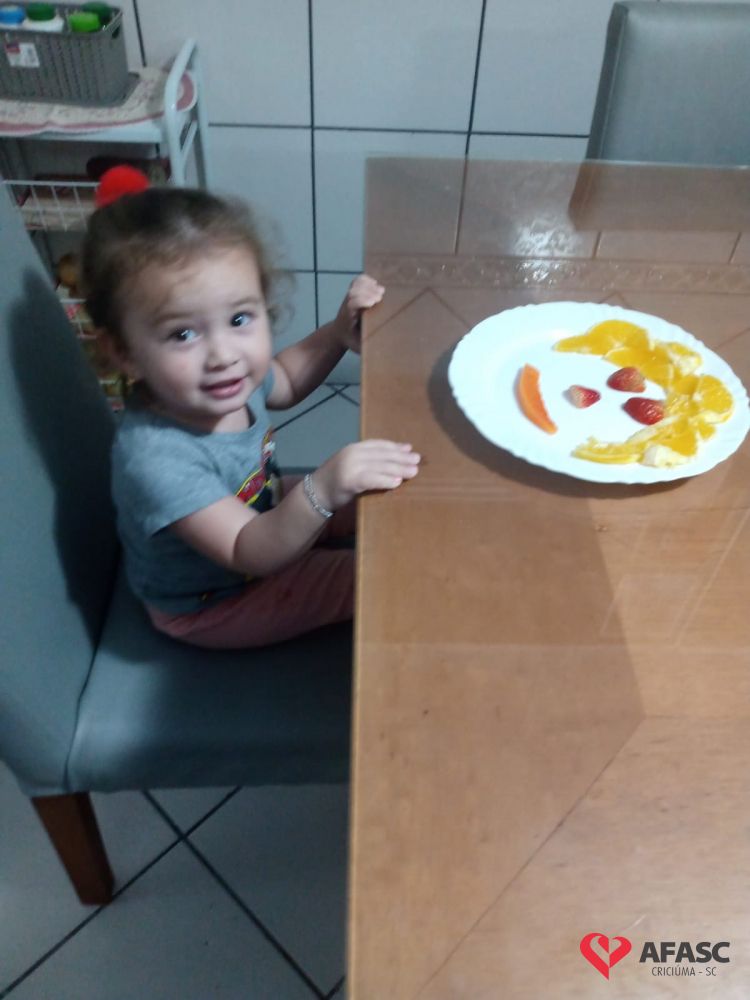 Com a ajuda dos pais, cada criança criou um prato divertido com frutas de sua preferência e outras desconhecidas, podendo assim conhecer novos alimentos.