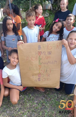 Em a alusão ao Dia Nacional de Combate ao Bullying e à Violência na Escola, lembrado nesta sexta-feira (07), as equipes do Serviço de Convivência da Afasc e do Serviço de Proteção e Atendimento Integral à Família (PAIF), realizaram diversas atividades durante esta terça (4) e quarta-feira (5), para discutir com crianças e adolescentes, sobre práticas voltadas a prevenção de conflitos e combate ao bullying.