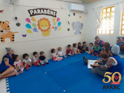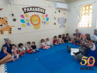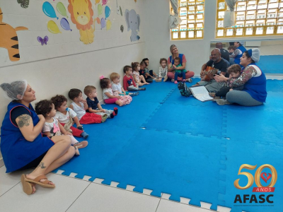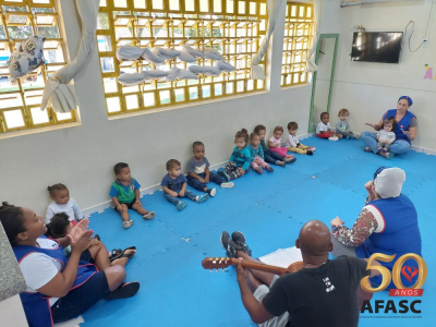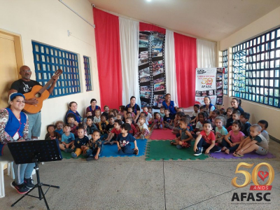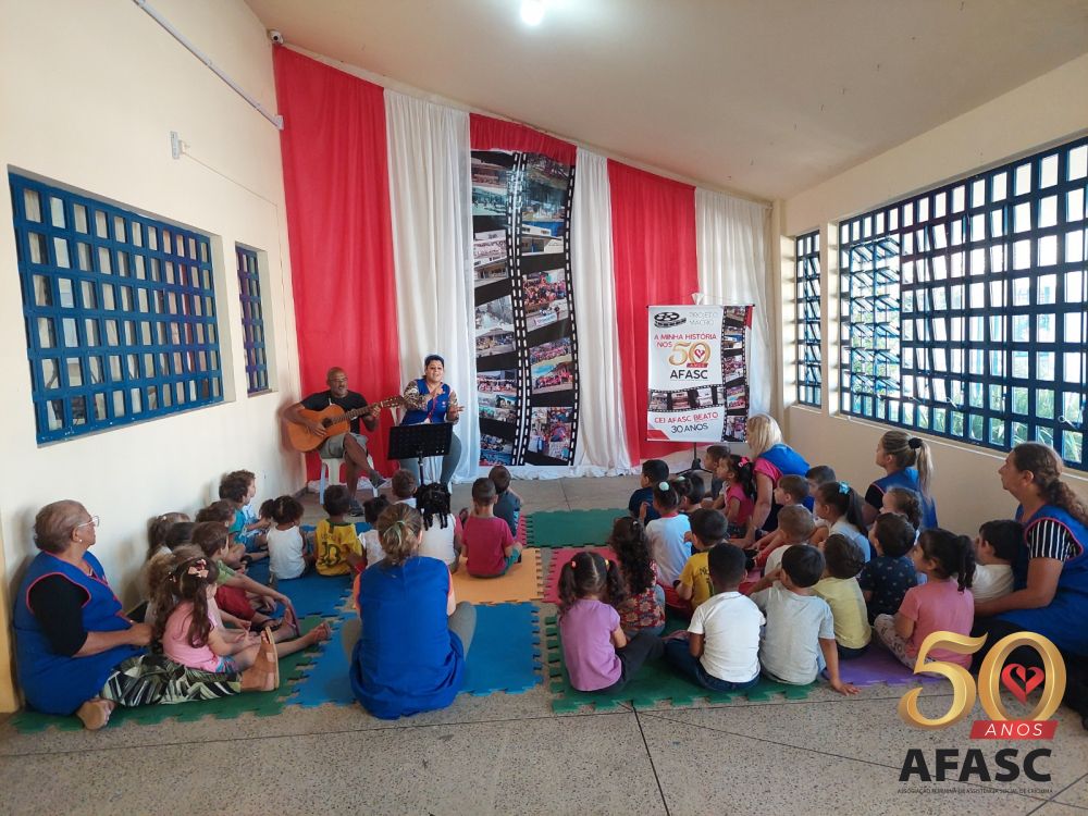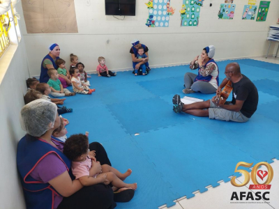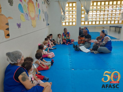 Para a abertura do projeto trimestral “Uma incrível viagem descobrindo meu corpo”, as professoras do Grupo 2 B, Kerolayne Silveira, Aline Eufrásio, Daiani Frasson e Polyana da Silva, convidaram o morador da comunidade, Edemilson da Rosa, para cantar músicas infantis para todas as turmas do CEI.