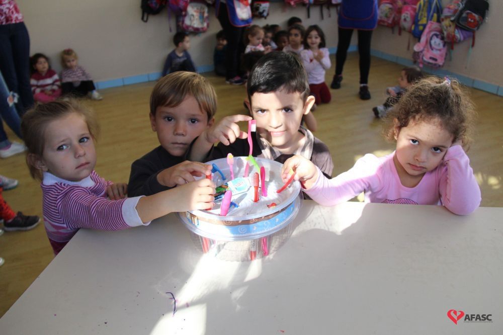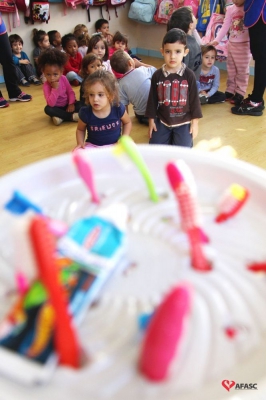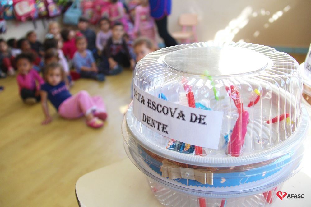 Para atrair ainda mais a atenção dos pequenos, uma ideia simples se mostrou muito efetiva. “Produzimos, em cada sala, um porta-escovas feito com fôrmas de bolo plásticas, que têm tampas transparentes. Assim, eles veem o colorido e sempre querem escovar os dentes”, explica.