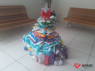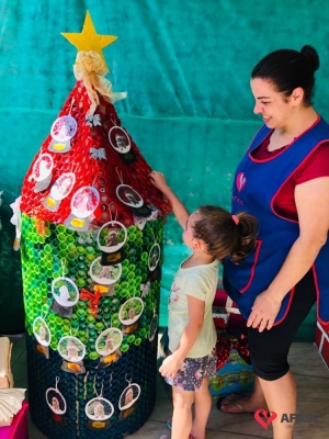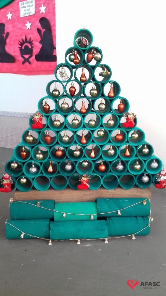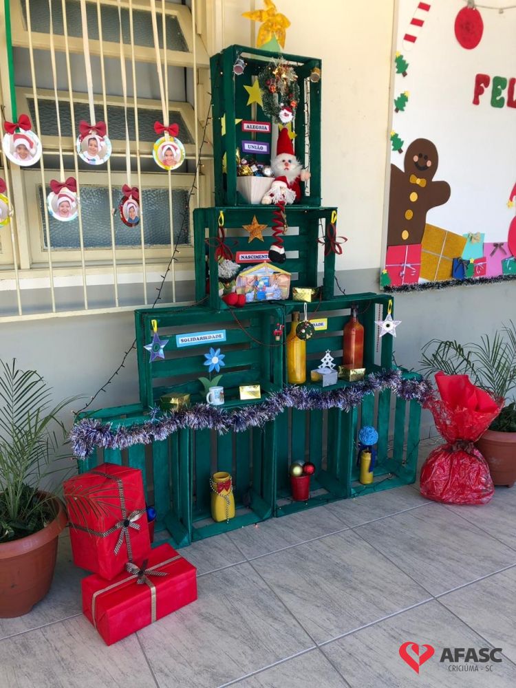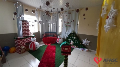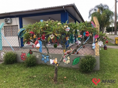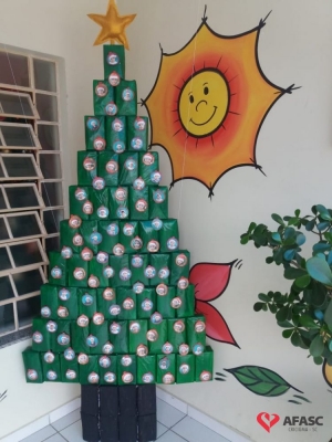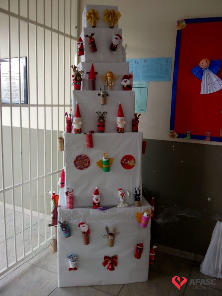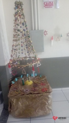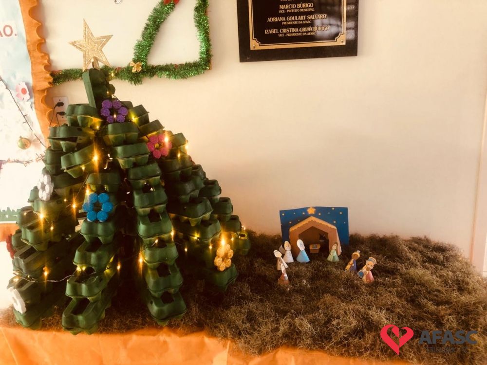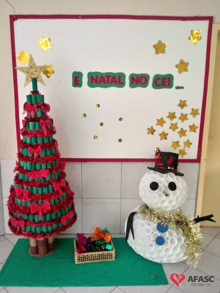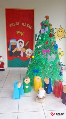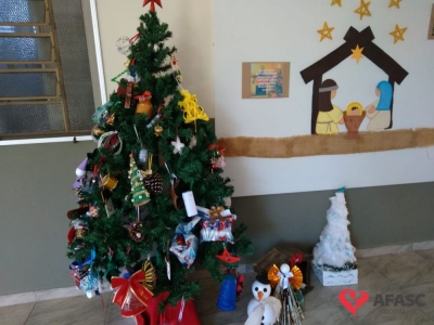 Copinhos plásticos, rolos de papel higiênicos, galhos secos, tampinhas de garrafa pet, entre outros produtos, fizeram parte dos materiais utilizados pelos Centros de Educação Infantil (CEI) da Associação Feminina de Assistência Social de Criciúma (Afasc), para enfeitar Hall das creches, portas de salas de aula e outros espaços. Em muitos educandários, a atividade contou com auxílio das famílias, que tiveram a tarefa de junto de seus filhos, confeccionar alguns enfeites para as árvores.