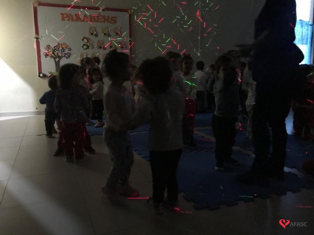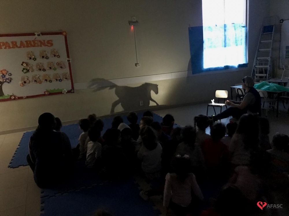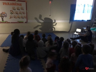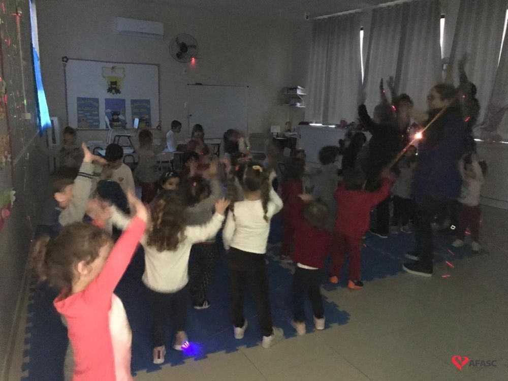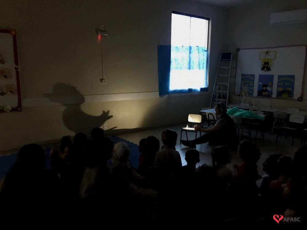 A atividade foi realizada em uma sala escura, com o uso de lanternas e moldes de animais, o que trouxe muita alegria para a tarde chuvosa desta sexta-feira (24).