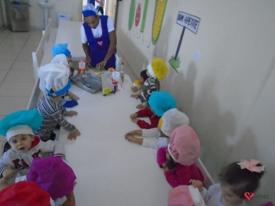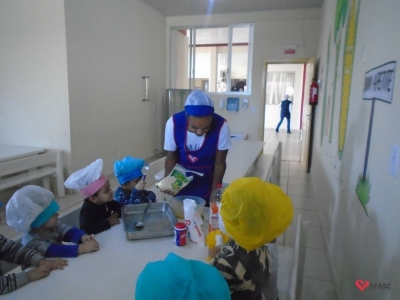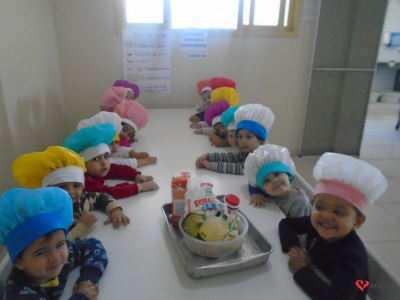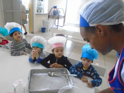 As crianças aliaram prática, respeito e amor no que se produz, seguindo a receita que era apresentada pelas professoras durante a produção do bolo de milho da “Galinha Ruiva”.