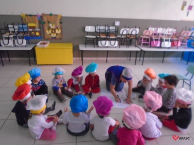 “Era uma vez uma galinha ruiva, que morava com seus pintinhos numa fazenda. Um dia ela percebeu que o milho estava maduro, pronto para ser colhido e virar um bom alimento. A galinha ruiva teve a ideia de fazer um delicioso bolo de milho. Todos iam gostar!”. Essa foi a história contada pelas professoras Alesandra Pignatel e Camila Santiago, para as crianças do Grupo 3 B do Centro de Educação Infantil (CEI) da Associação Feminina de Assistência Social de Criciúma (Afasc) Branca de Neve, que proporcionou a construção de conceitos matemáticos, utilizando ações cotidianas que envolvam medidas ao produzirem o bolo de milho.