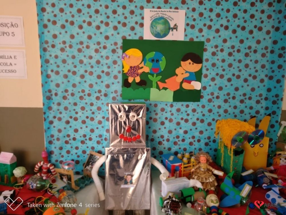 O Centro de Educação Infantil (CEI) da Associação Feminina de Assistência Social (Afasc) Carmela Benedet Casagrande, transformou parte de seu espaço em uma Galeria de Arte. Todas as turmas da creche confeccionaram lindos brinquedos com materiais recicláveis, que estão em exposição no local. A atividade faz parte das comemorações em alusão ao Dia Mundial do Meio Ambiente, que foi comemorado nesta quarta-feira (5), e segue com ações pelos próximos dias.