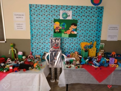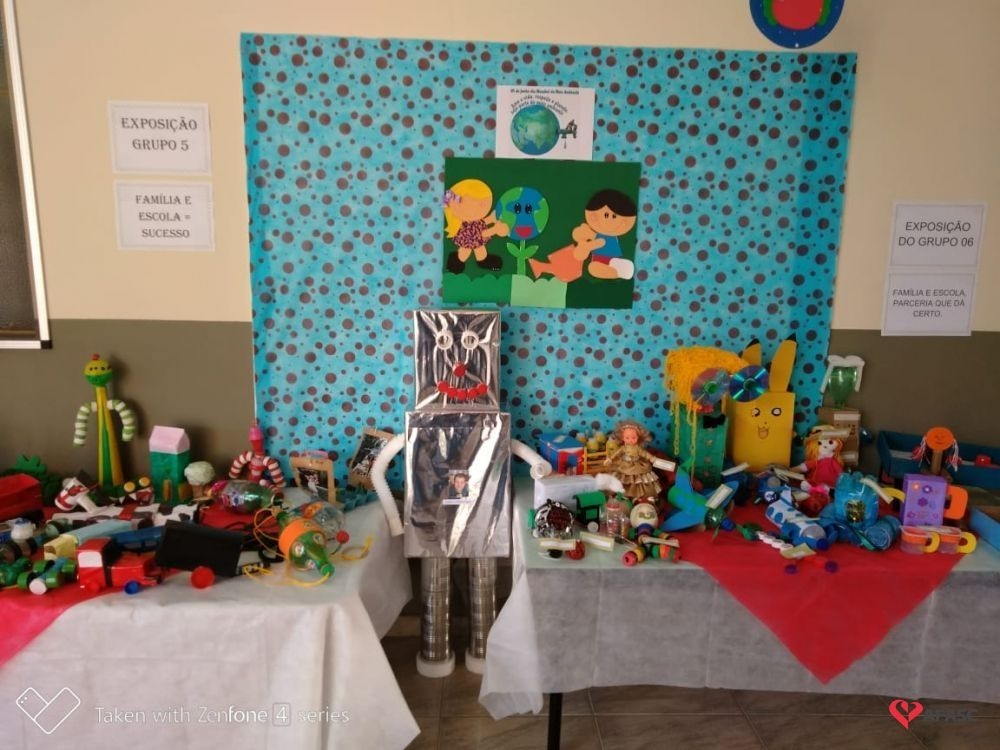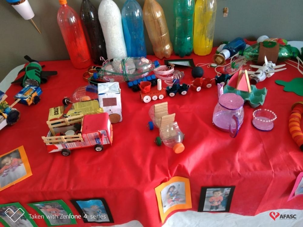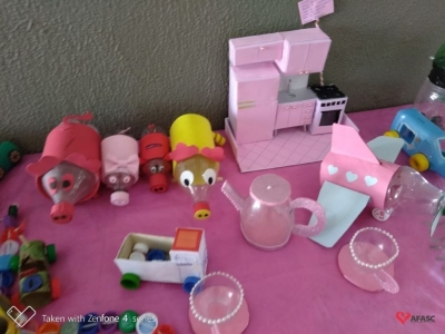 Brinquedos recicláveis estão em exposição no CEI Afasc Carmela Benedet Casagrande