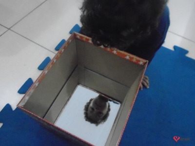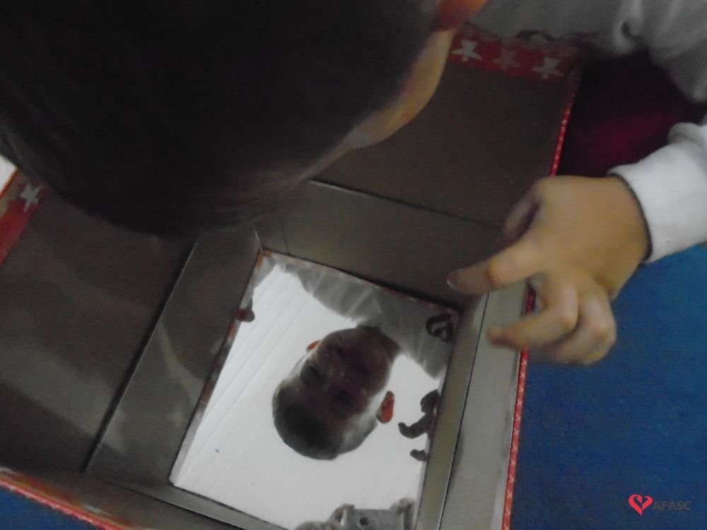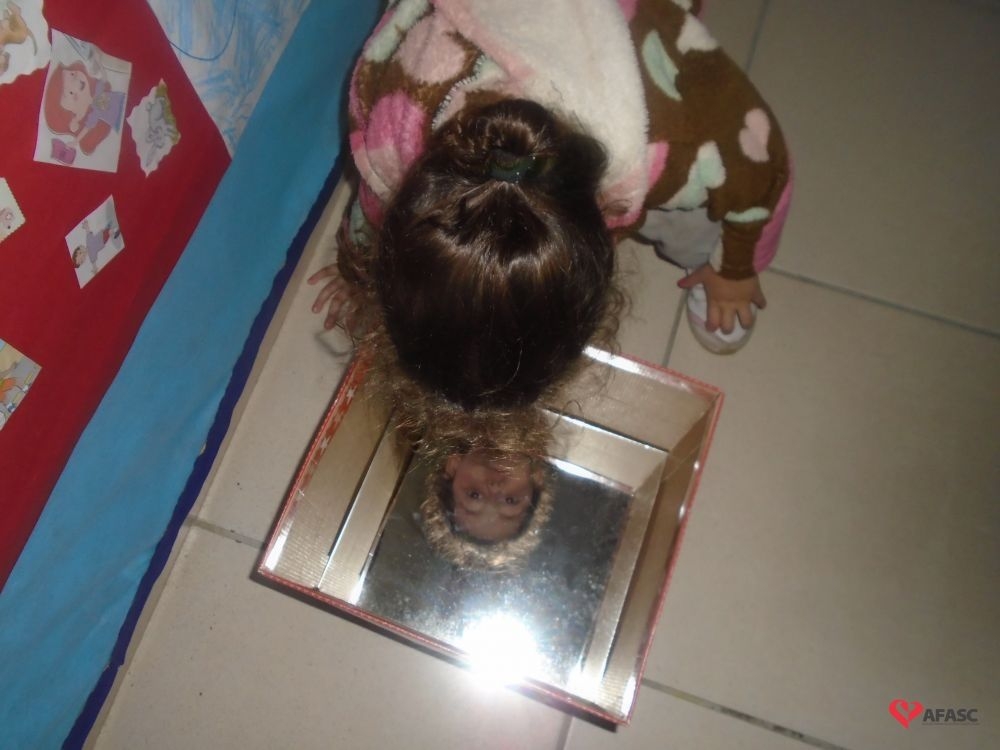 A atividade foi realizada pelas professoras Edna Pereira e Lenir da Silva, e contou com uma “caixa surpresa”, onde havia um espelho e a criança via o tesouro, que era sua própria imagem.