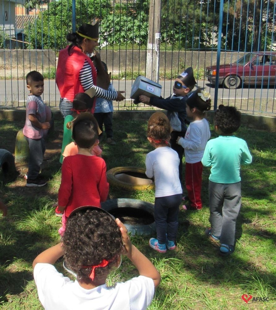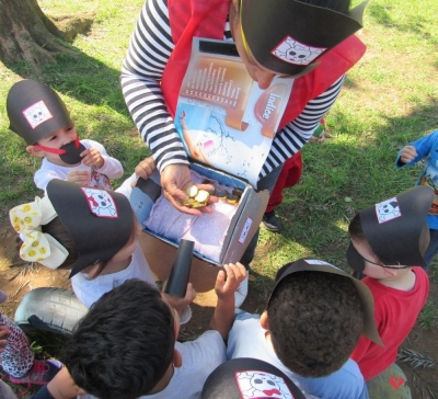 Para ampliar o conhecimento das crianças, as professoras Maria Helena e Carolina realizaram uma caça ao tesouro. Pistas foram deixadas pelo CEI para chegar até o baú do pirata, que estava com muitas moedas de ouro.