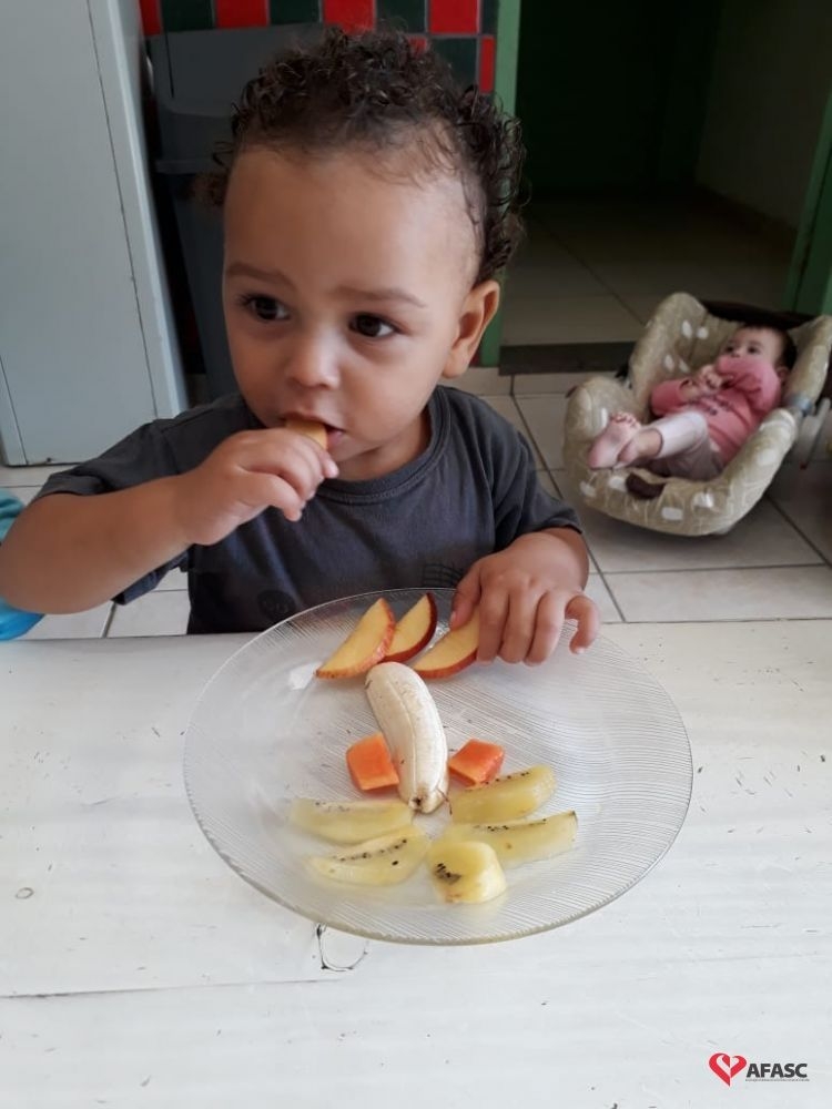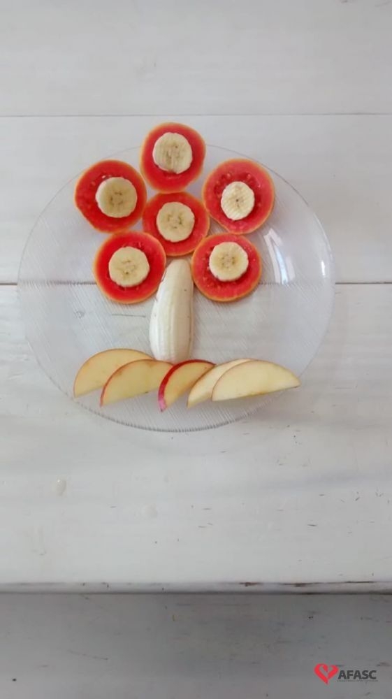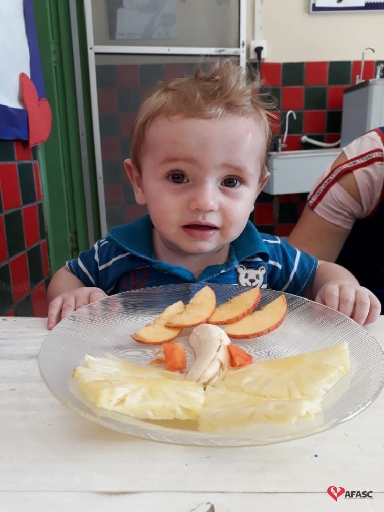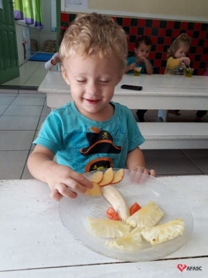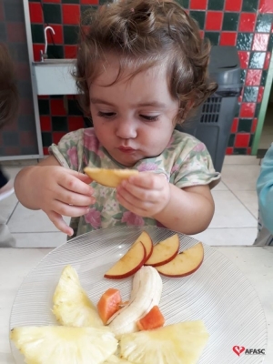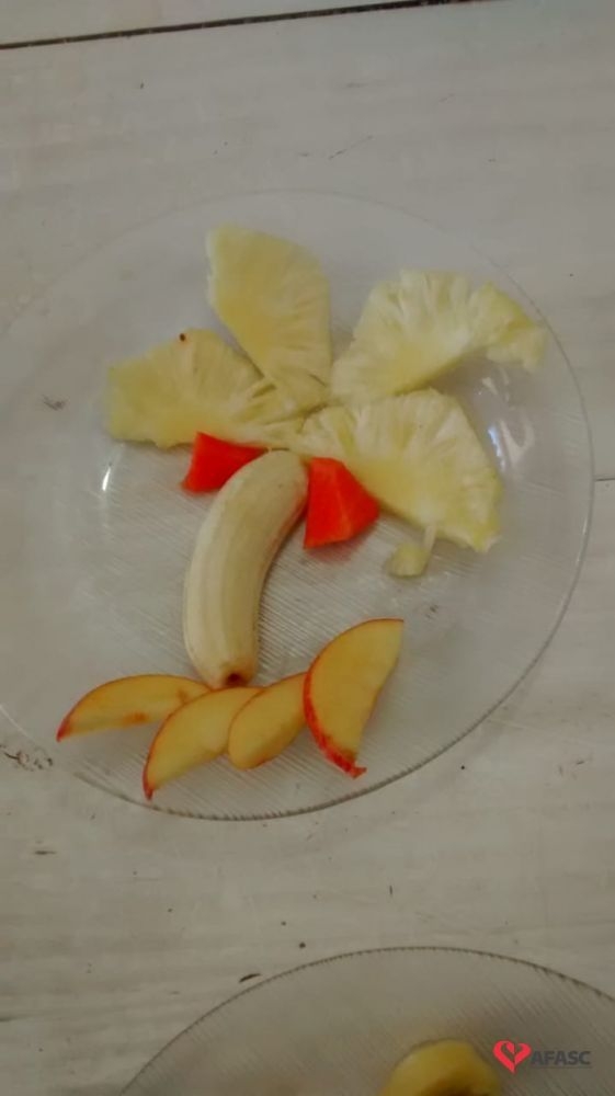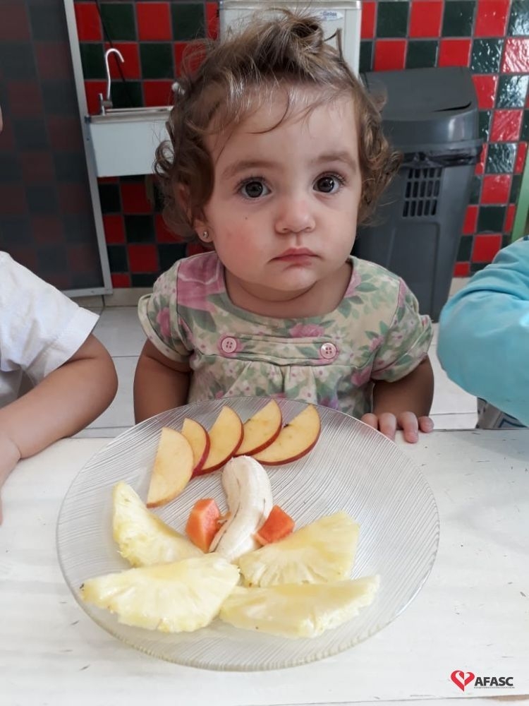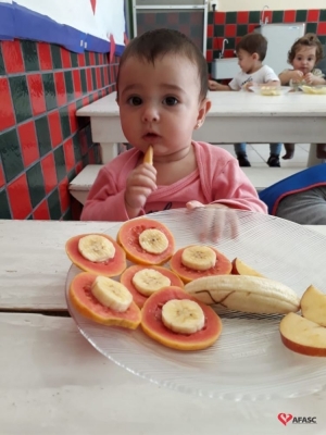 Para preparar as crianças para a descoberta de novas sensações, as professoras Aline Cesário e Susi Minatto, realizaram a atividade Degustar diferentes frutas de maneira divertida, onde cada aluno recebeu um prato com frutas que formavam desenhos.