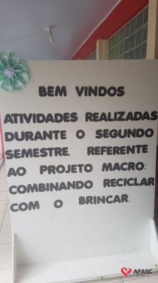 Durante o segundo semestre de 2019, o Centro de Educação Infantil (CEI) da Associação Feminina de Assistência Social de Criciúma (Afasc) Umberto Cesa, realizou diversas atividades ligadas ao Projeto Macro “Combinando o reciclar com a brincar”. Durante todo os últimos meses do ano, as crianças e suas famílias foram conscientizadas sobre a importância de reciclar, e utilizar sua criatividade para desenvolver algo novo, com o que possivelmente será descartado.