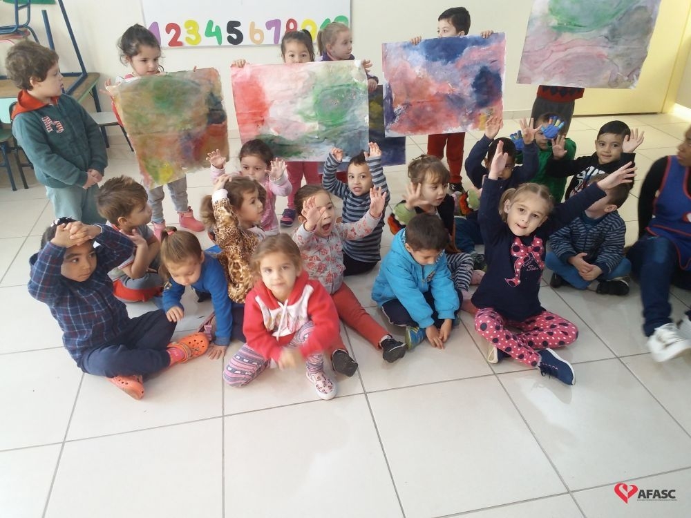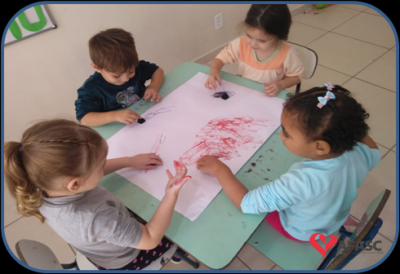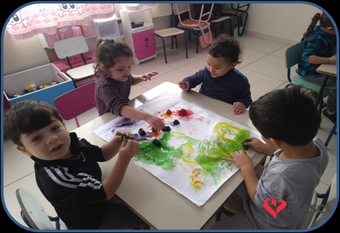 Pensando em mostrar melhor a temperatura que os esquimós enfrentam, as educadoras fizeram uma mistura de tinta e gelo, e transformaram em pedras de gelo, que depois foram utilizadas para fazer pinturas em pedaços de papel. “Cada criança escolheu o gele de sua cor preferida, e em equipe, com grandes pedaços de papel começaram a desenhar com gelo. Eles sentiram e vivenciaram a mágica da transformação do gelo em água, que virou tinta, resultando em obra de arte. Eles tiveram a sensação do frio, que despertou alegria e descontração na turma; e de forma lúdica entenderam como e qual é a temperatura da casa dos esquimós”, comenta Janaina.