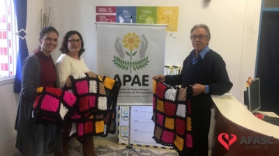 Pensando em aquecer os alunos cadeirantes da Associação de Pais e Amigos dos Excepcionais (APAE) de Criciúma, o Clube de Mães da Associação Feminina de Assistência Social de Criciúma (Afasc) da Coloninha Zilli, confeccionou quatro cobertores de crochê. A entrega foi realizada na última semana, o que provocou muita alegria tanto para a direção da APAE quanto para as participantes do serviço da Afasc.