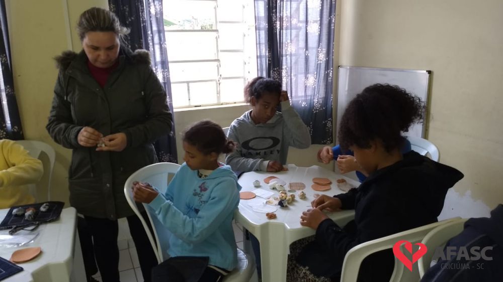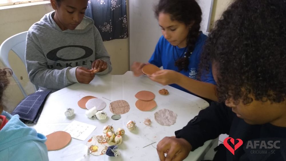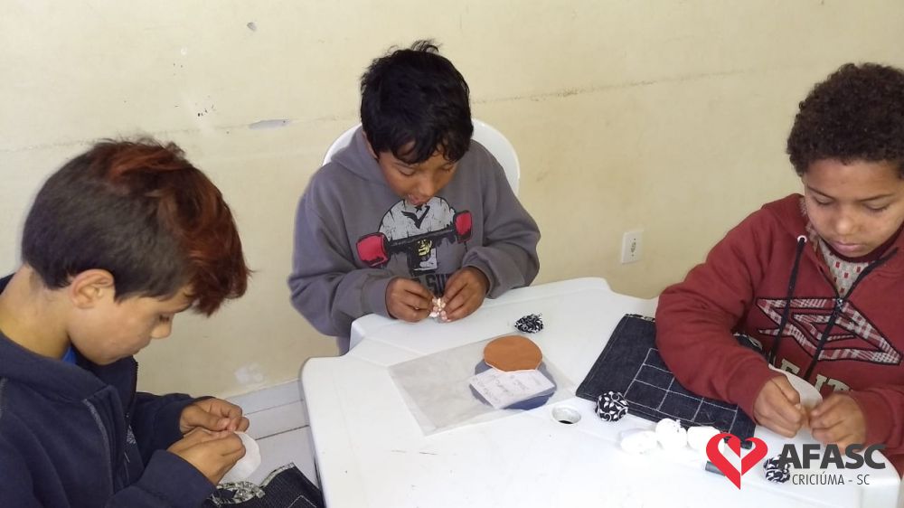 Crianças e adolescentes receberam da voluntária Sônia Pedro Felisberto, moradora do bairro Renascer, uma bolsa customizada que se torna um tabuleiro de jogo, tanto para o famoso “Jogo da Velha”, quanto para o das “Seis Marias”. Com a ajuda da facilitadora Michele Pereira, os participantes confeccionaram as peças do jogo em formato de fuxico, que ficam guardadas dentro da bolsa.
