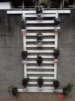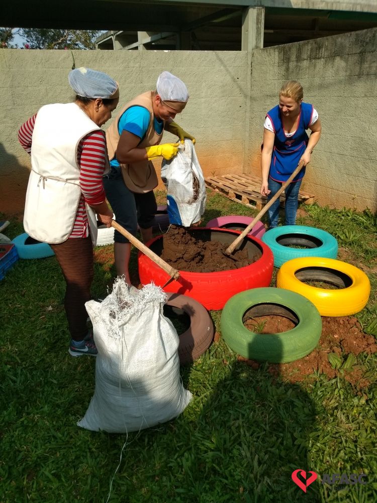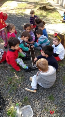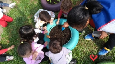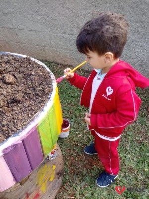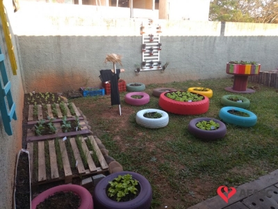 Para desenvolver as práticas de plantio, acompanhar processo de preparação de canteiros feitos com materiais recicláveis e confeccionar suportes de madeira, as crianças dos Grupos III e IV, com a colaboração das professoras Juselia dos Santos, Neusa da Silva, Rosilete Marcolino e Rosimare Cabral, das serventes, Marizete Trento e Sonia dos Santos, da diretora, Giane de Jesus e do pai, Apolônio Tomé, trabalharam na horta escolar.