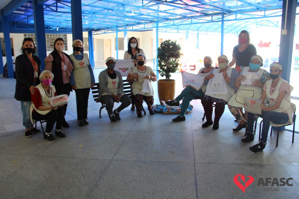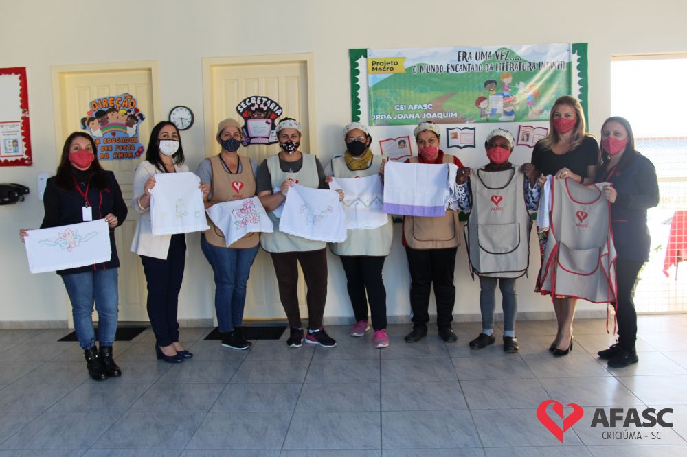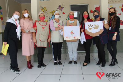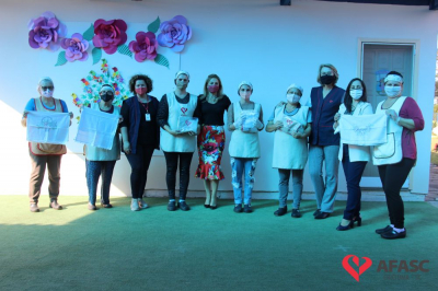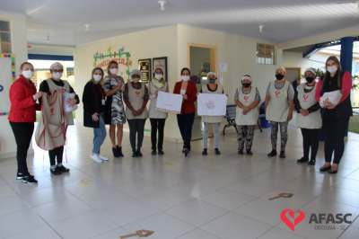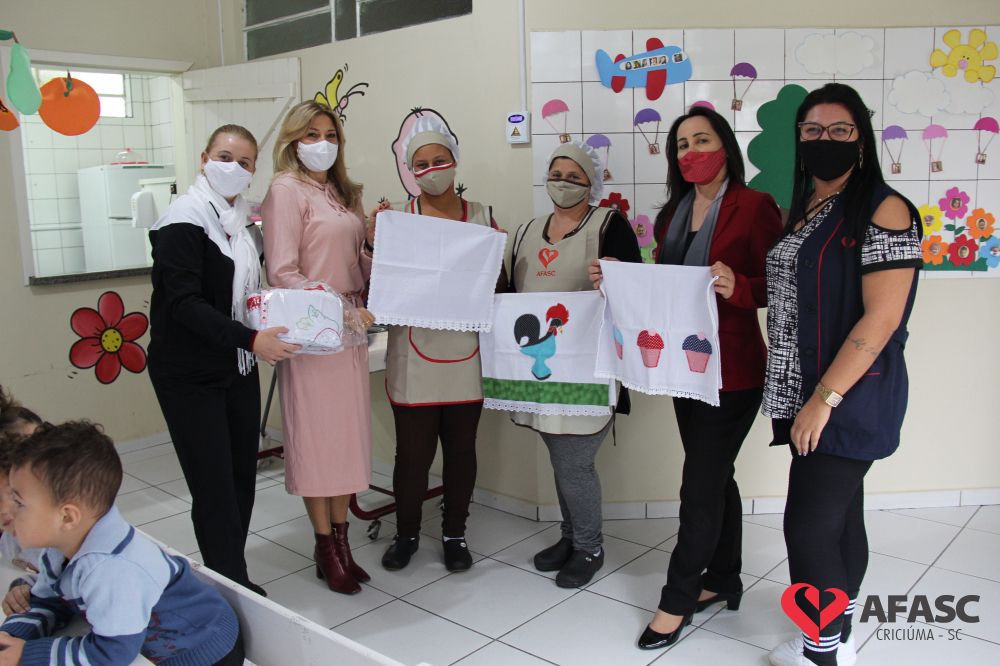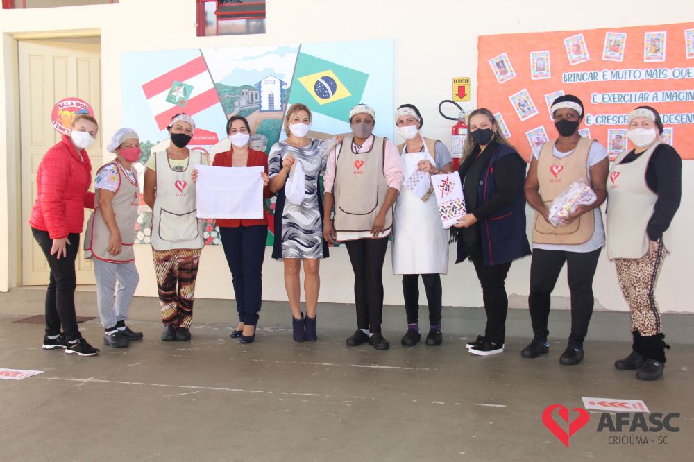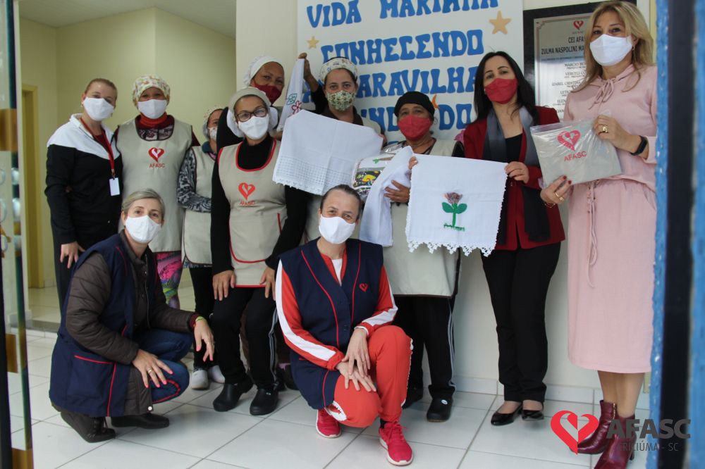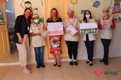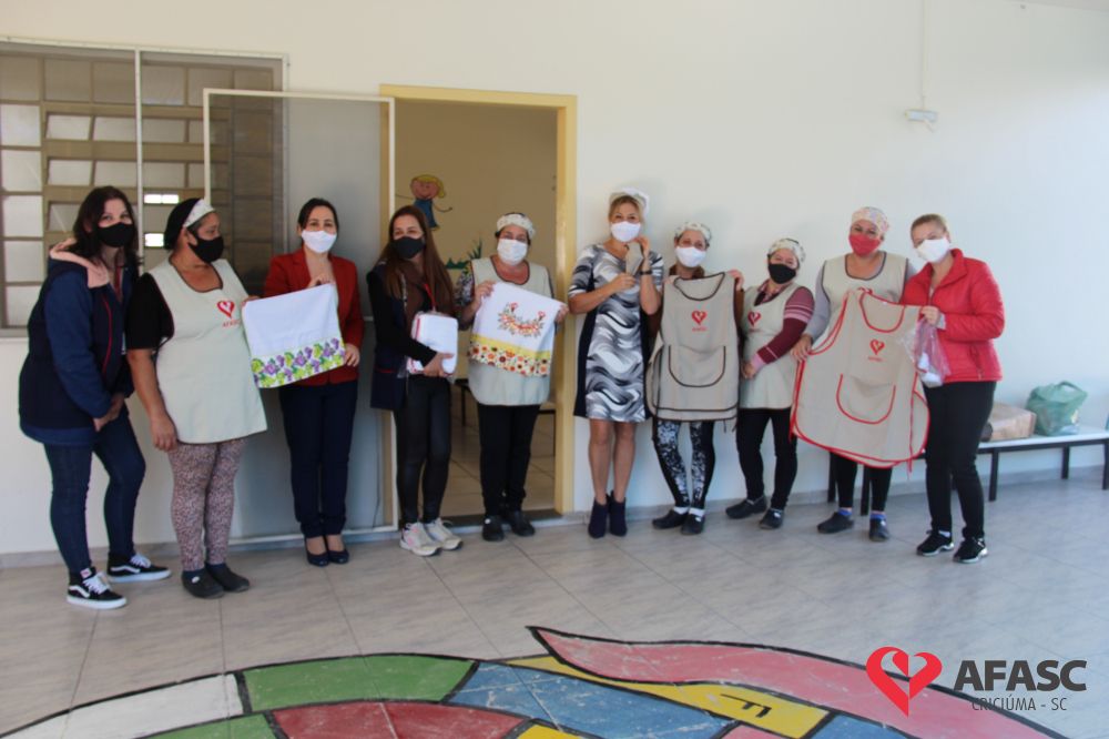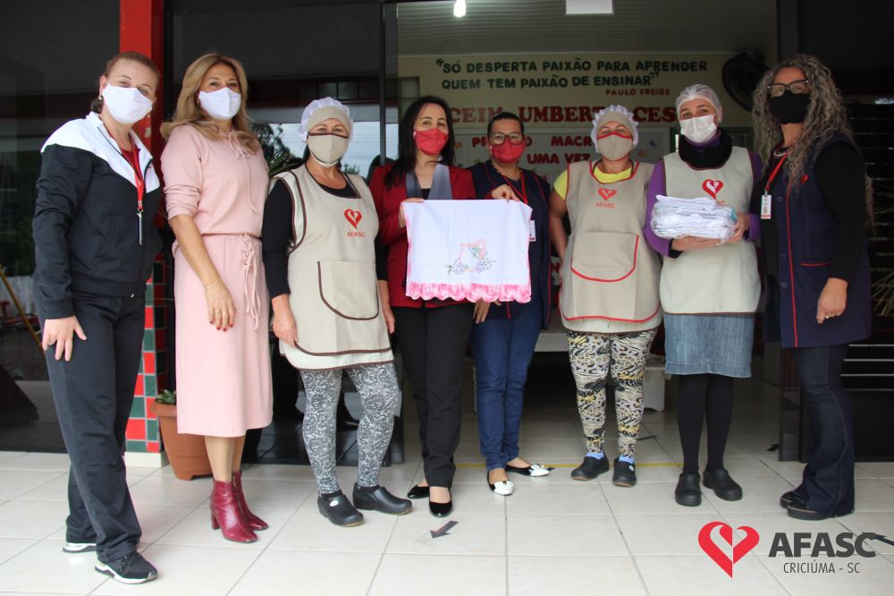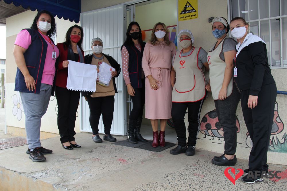 Na tarde desta quinta-feira (20), a coordenadora do Departamento de Educação Infantil (DEI), Andreza Dagostim, acompanhada da presidente de honra, Adriana Goulart Salvaro e da presidente do Conselho Administrativo da Afasc, Robinalva Ferreira, realizaram as últimas entregas de toalhas produzidas pelas participantes dos Clubes de Mães, os novos uniformes do apoio, confeccionados pelas monitoras do departamento de Clubes de Mães no ateliê da instituição e dos materiais de Educação Física. Cada profissional de limpeza irá receber dois kits contendo avental, máscara e toca.