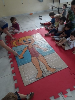 Aprender sobre o corpo humano é uma etapa muito importante na vida das crianças. É nesse período que os pequenos descobrem mais sobre sua função motora e seus sentidos. Pensando desta forma a professora Gabriela Alves e as estagiárias Franciele Domingos e Pâmela Figueiredo, que atuam no Grupo 2 B do Centro de Educação Infantil (CEI) da Associação Feminina de Assistência Social de Criciúma (Afasc) Brasília estão realizando o projeto “Brincando e aprendendo com o corpo”, onde estão ensinando as crianças partes do corpo de maneira lúdica.