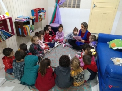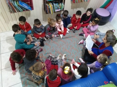 As educadoras trabalharam com as crianças a história “O lobo e os sete cabritinhos”, após a contação de história, os alunos brincaram de “cabritinho sai da toca”, sendo essa uma brincadeira que utiliza recursos simples e desenvolve a coordenação motora, a concentração e a criatividade.