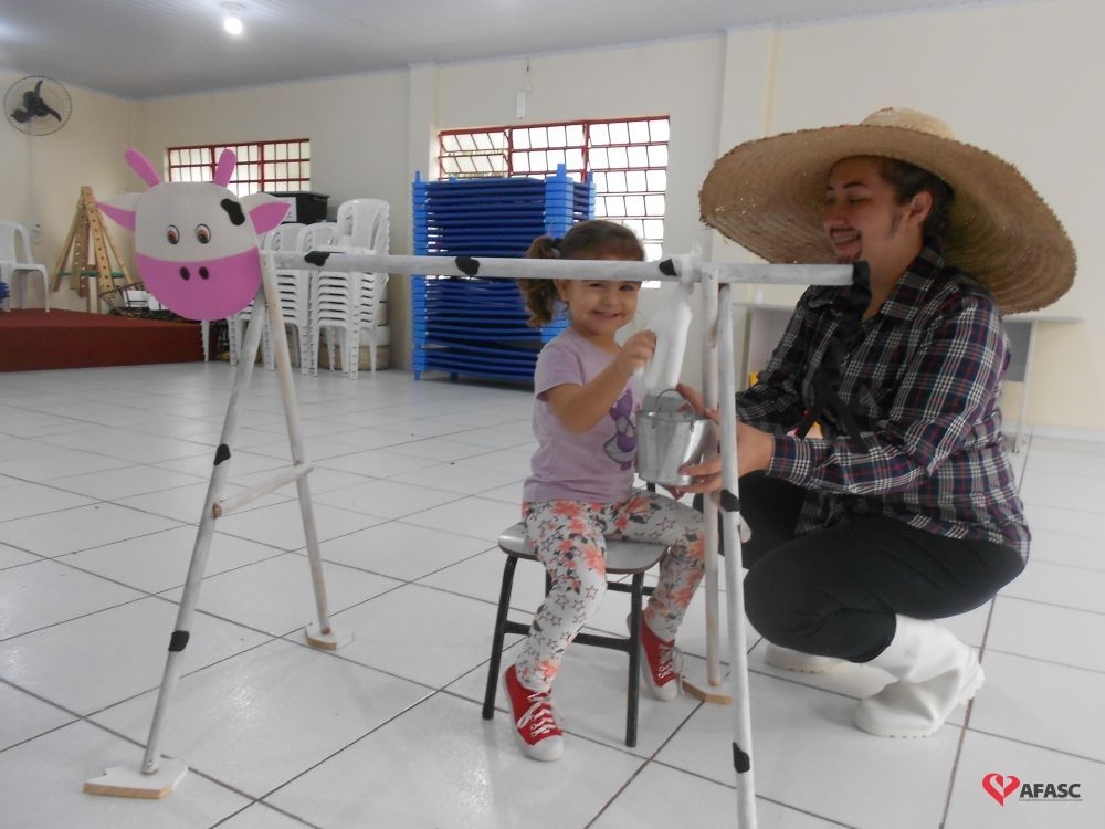 Após ouvirem a história, as crianças com ajuda das professoras e do zelador, Ariovaldo Martins, construíram uma vaca, utilizando cavalete, luva de látex, água e tinta branca. Os alunos foram convidados a “ordenharem” o leite.