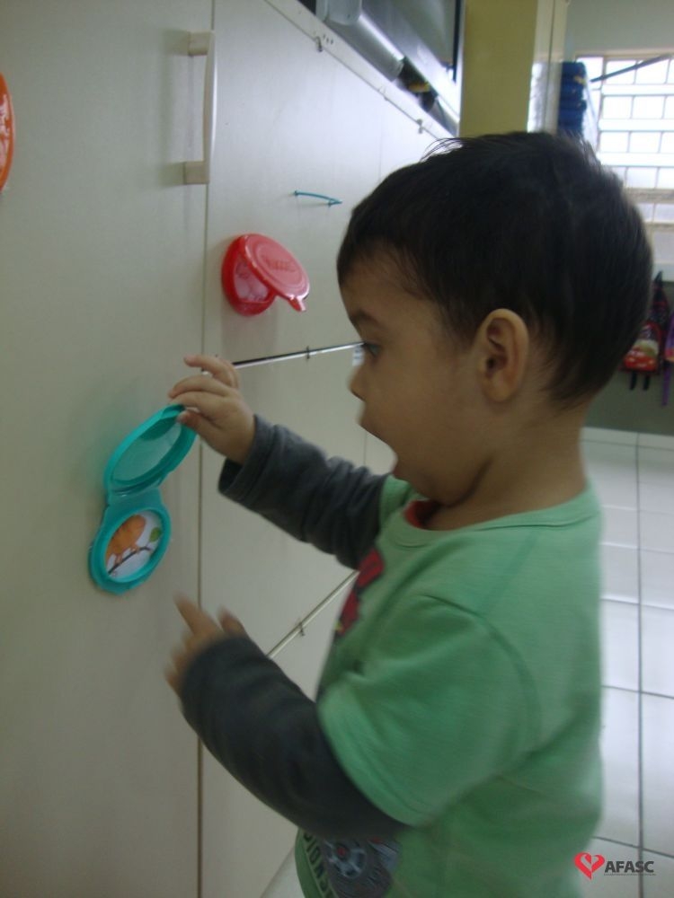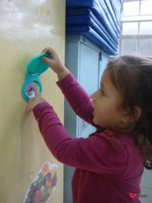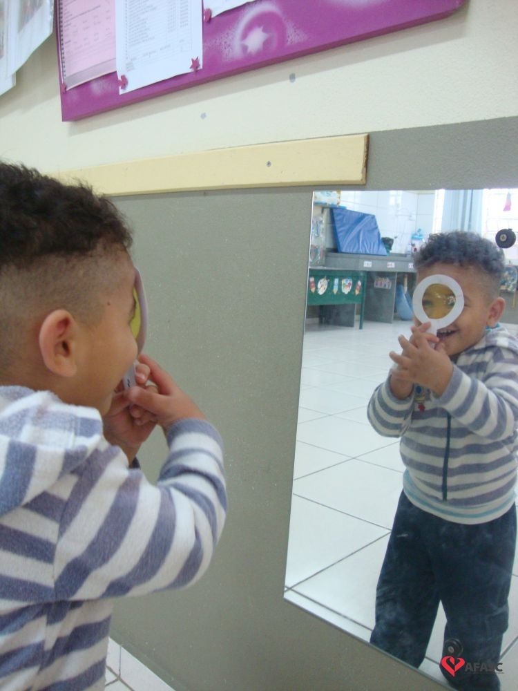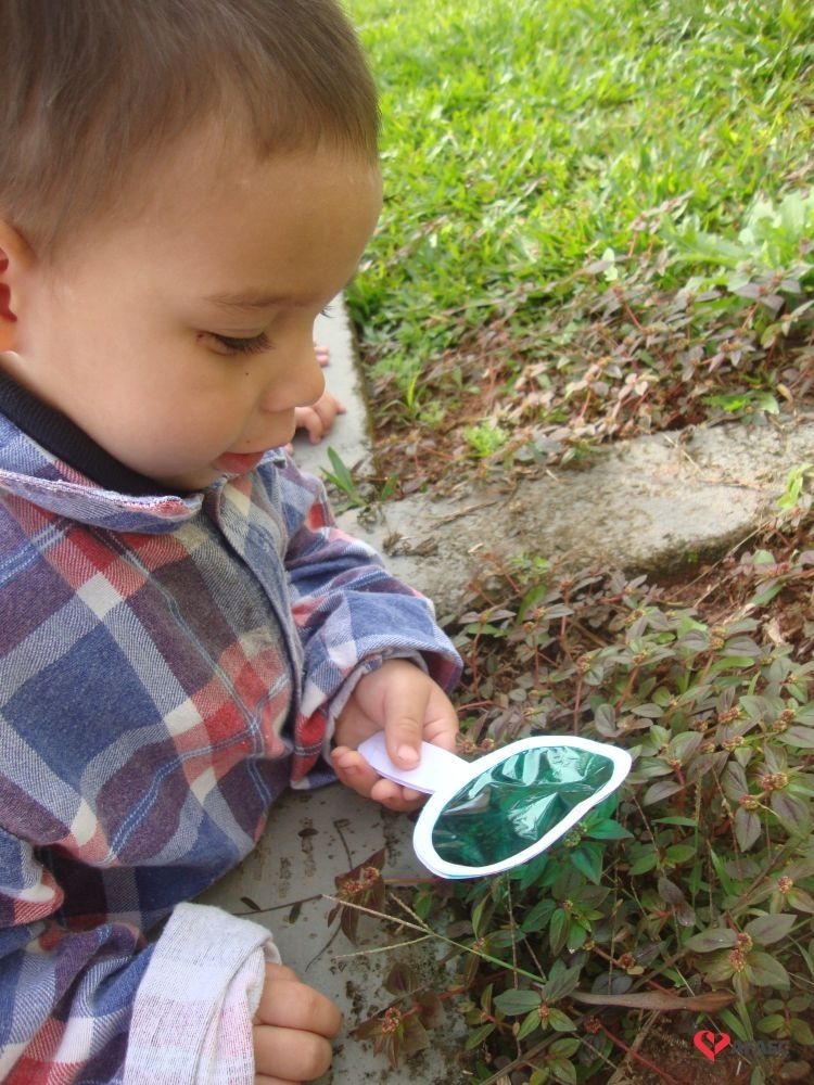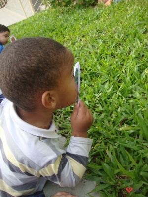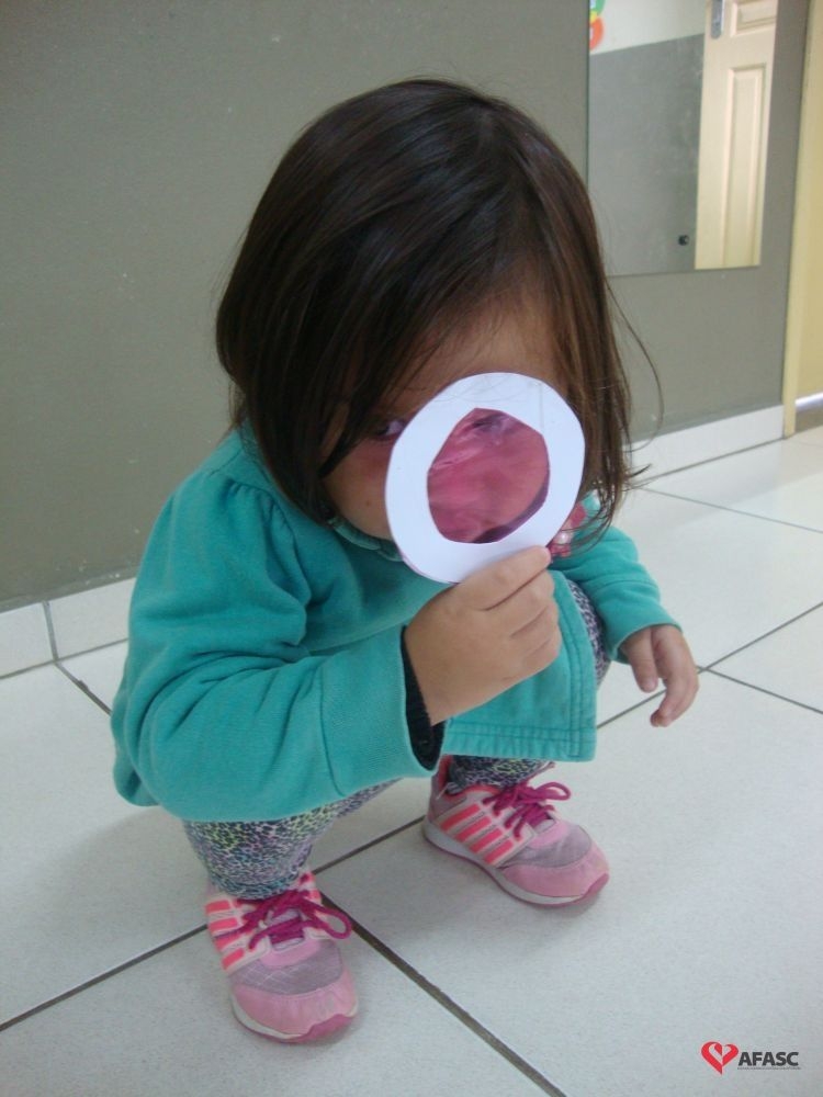 Segundo Jusélia, as crianças pequenas são sempre atraídas por objetos coloridos, onde exploram a criatividade, a linguagem artística, entre outras ações. “Conversamos sobre a história, fizemos a atividade com tampinhas de lenço umedecido fixado no armário da sala, com camaleões e com as cores que apareceram na história. Cada criança abriu e falou a cor que sabia, quem ainda não sabia, repetiu junto com as professoras. Tivemos ainda as lupas coloridas confeccionadas com papel celofane. Cada criança foi com a sua lupa passear no pátio para observar o jardim e a natureza nos arredores do CEI”, comenta.