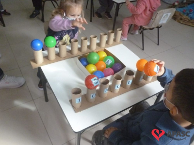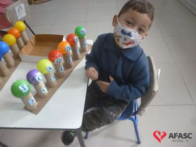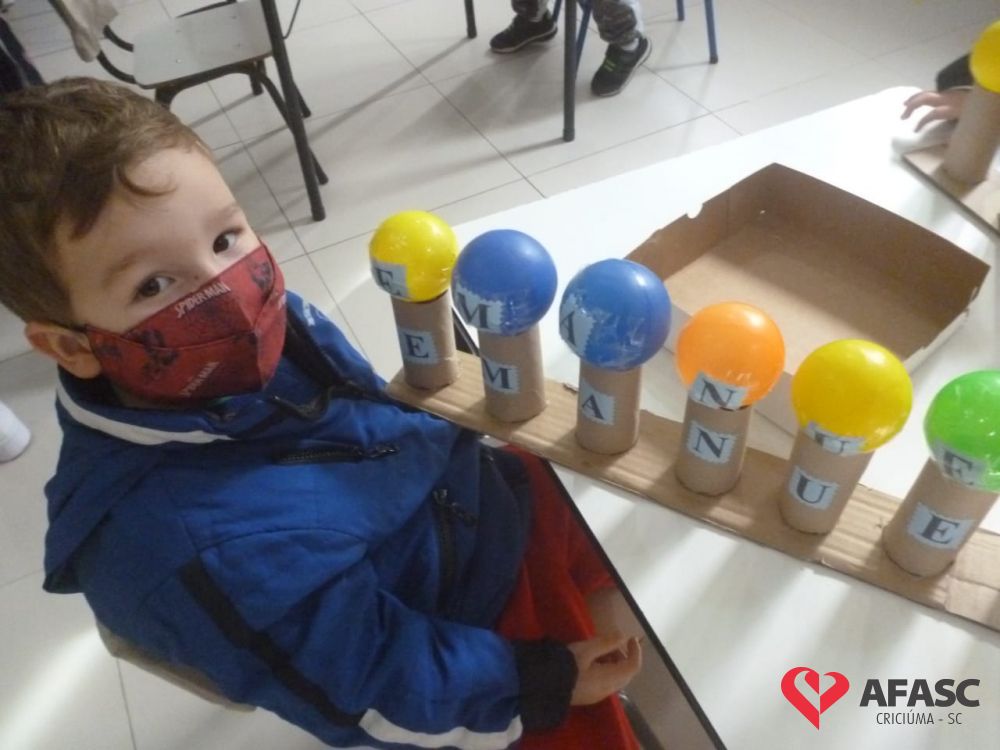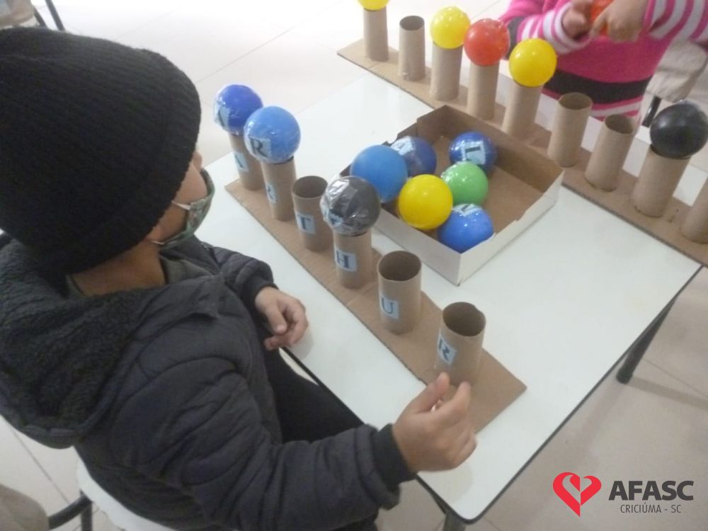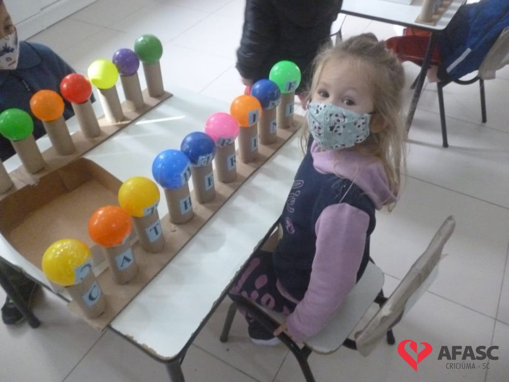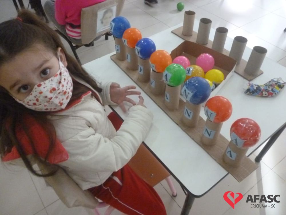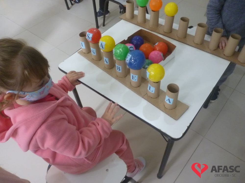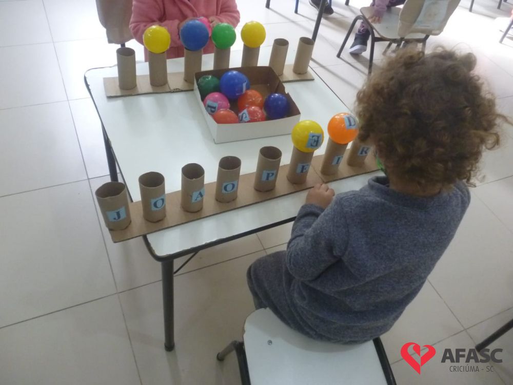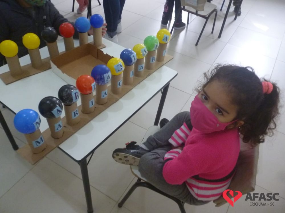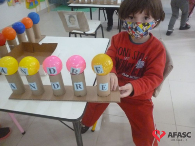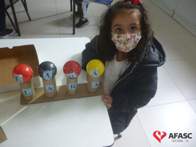 Priorizar atividades reflexivas relacionadas ao conhecimento da história do próprio nome. Esse foi o principal objetivo das professoras Ana Claudia Pereira, Rosa Marlene e Josiane da Rosa do Grupo 4 B do CEI Afasc Pequeno Polegar, ao desenvolverem a atividade “montando o nome com bolinhas coloridas”. A atividade faz parte do projeto “Alfabeto, Meu Nome e Minha Identidade”, que possibilitou que as crianças aprendessem as letras do alfabeto e a formar seu nome, através de uma prática lúdica.