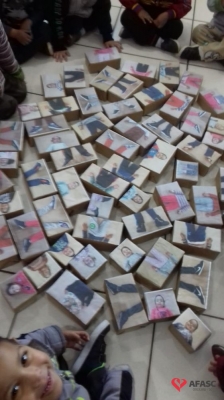 Para produzir o brinquedo, as crianças dividiram suas fotos em três partes, separando em cabeça, tronco e membros, e colaram em caixas de leite, que estavam encapadas com papel pardo, para facilitar o manuseio.