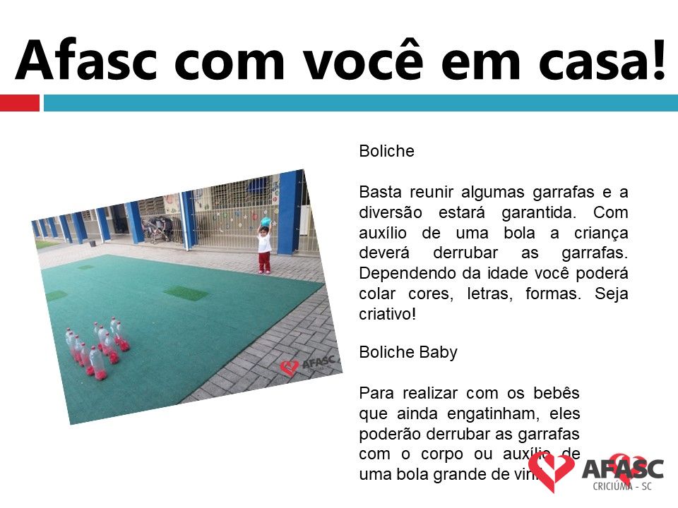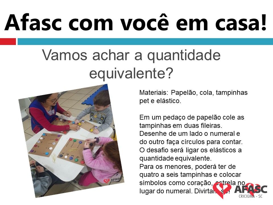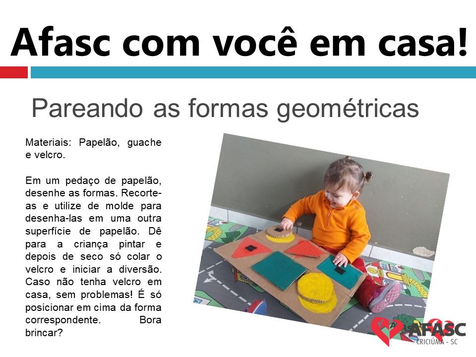 O Departamento de Educação Infantil (DEI) da Associação Feminina de Assistência Social de Criciúma (Afasc) solícito com as famílias atendidas nos 35 Centros de Educação Infantil (CEI) durante esse período de quarentena do Covid 19, está propondo algumas atividades recreativas para que seja executada com as crianças em suas residências. As brincadeiras foram divididas de acordo com a faixa etária utilizada pela instituição.