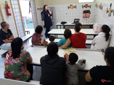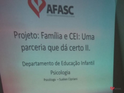 A família é o ponto de referência para a criança, bem como sua casa. A escola entre na vida dela ampliando sua noção de espaço e seu sentimento de integração ao mundo. Com o intuito de promover a integração escola/família, a fim de fortalecer os vínculos entre essas duas instituições tão importantes para o desenvolvimento das crianças em seus primeiros anos de vida, a psicóloga do Departamento de Educação Infantil (DEI) da Associação Feminina de Assistência Social de Criciúma (Afasc), Suelen Cipriani, está realizando nos Centros de Educação Infantil (CEI) com os pais o projeto “Família e CEI: uma parceria que dá certo II”.