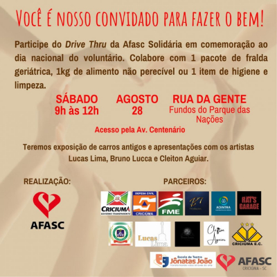 Celebrar o “Dia do Voluntário” e ajudar a população carente. Esse é o objetivo do Drive Thru da Afasc Solidária, que será realizado neste sábado (28), das 9 horas às 12h, na Rua da Gente, ao lado do Parque das Nações. O evento que contará com apresentações artísticas, exposição de carros antigos, equipe do Criciúma Esporte Clube, entre outros parceiros, acontecerá no intuito de arrecadar fraldas geriátricas, alimentos não perecíveis e produtos de higiene e limpeza.