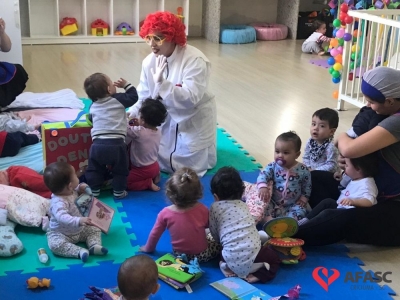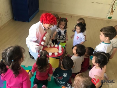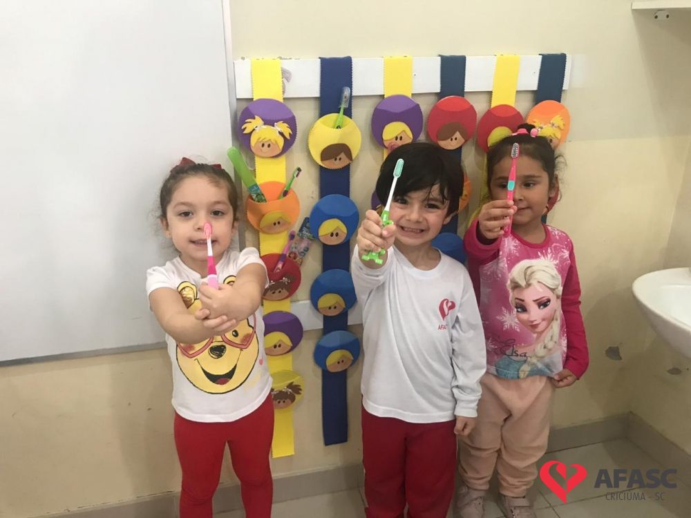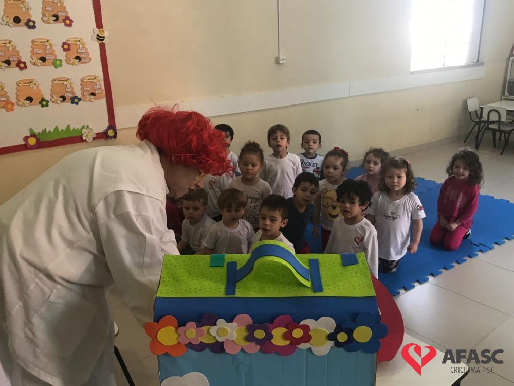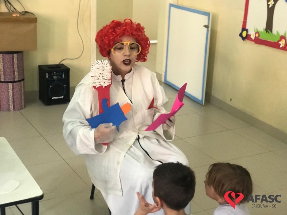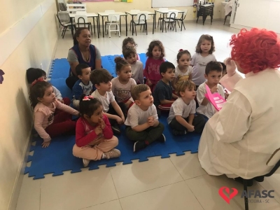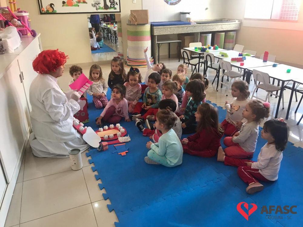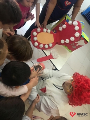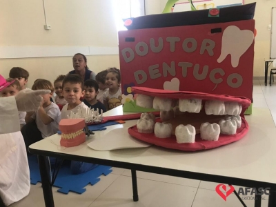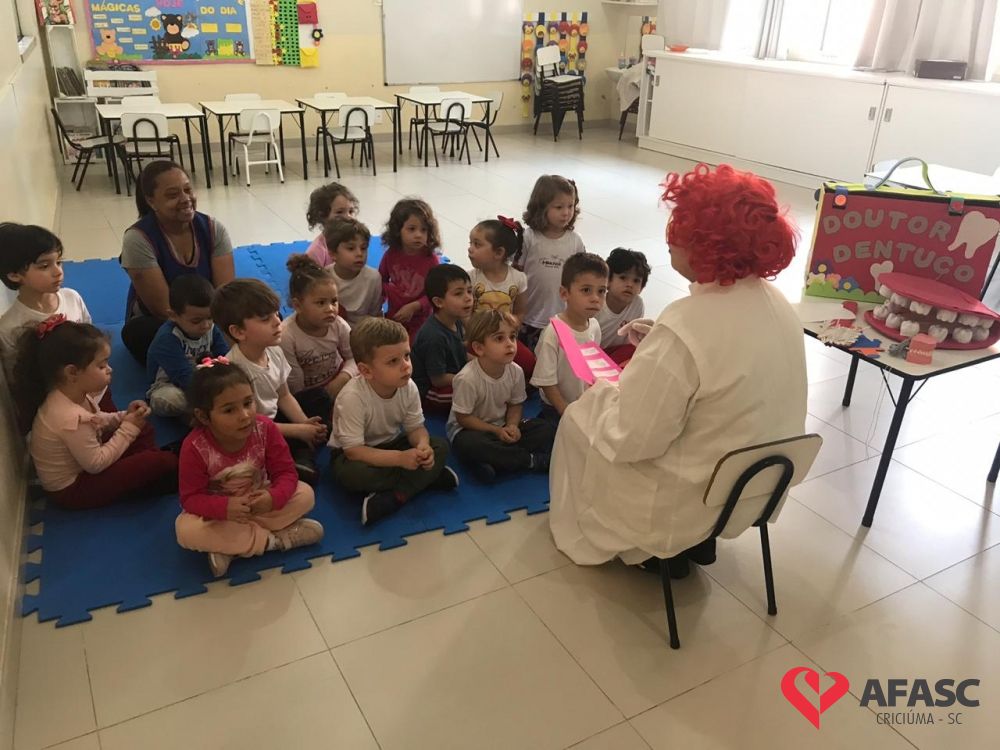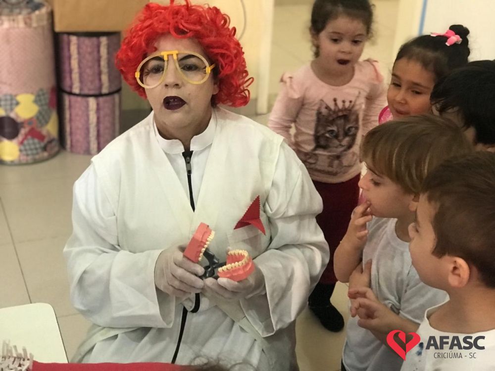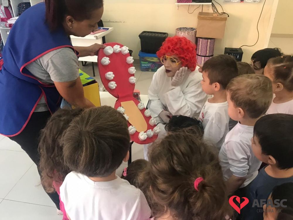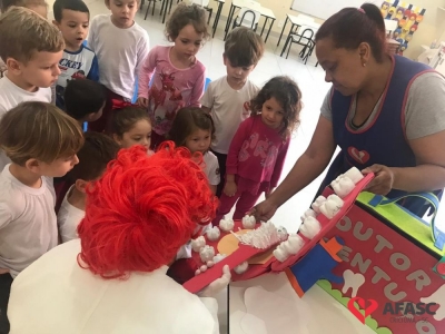 Nesta quinta-feira (08), as crianças do Grupo IV do Centro de Educação Infantil (CEI) da Associação Feminina de Assistência Social de Criciúma (Afasc) Pequeno Polegar receberam uma visita especial. Com uma maleta gigante com todos os equipamentos para escovação e higienização bucal, a Doutora Dentuça chegou à sala de aula, e fez a alegria das crianças ao contar uma história sobre a importância de escovar os dentes. A atividade foi organizada pelas professoras Ianai Crispim e Rosa Nunes.