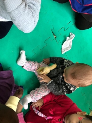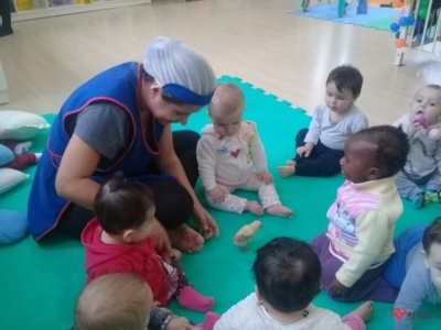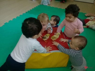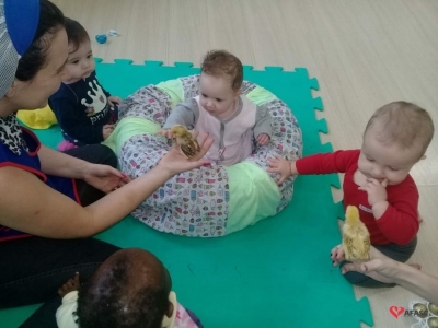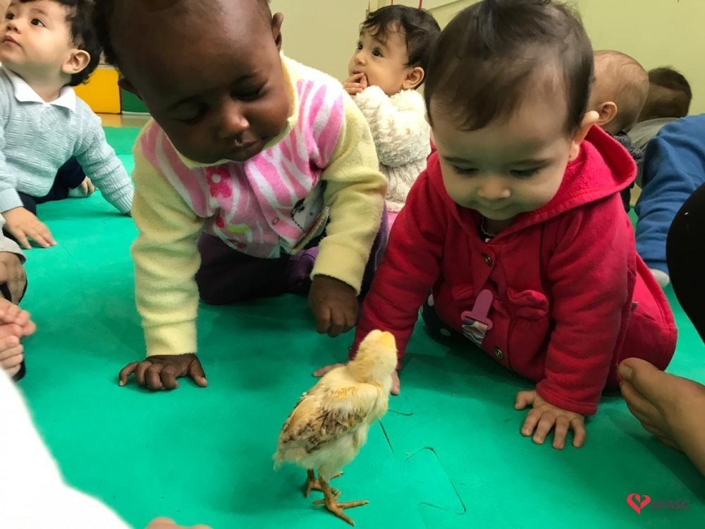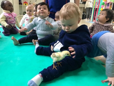 Durante as atividades, as educadoras cantaram fazendo gestos e o sons, que aguçaram a curiosidade das crianças e as mantiveram atentas a todo o momento. Para completar o desenvolvimento dos exercícios, foi levado para a sala de aula dois pintinhos, o que causou muita surpresa nos pequenos.