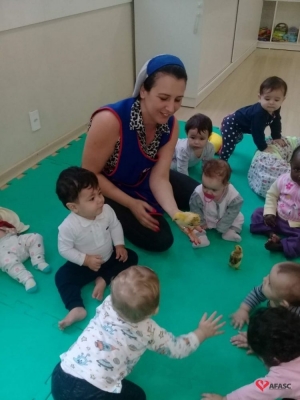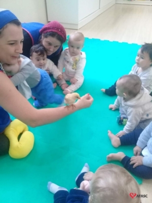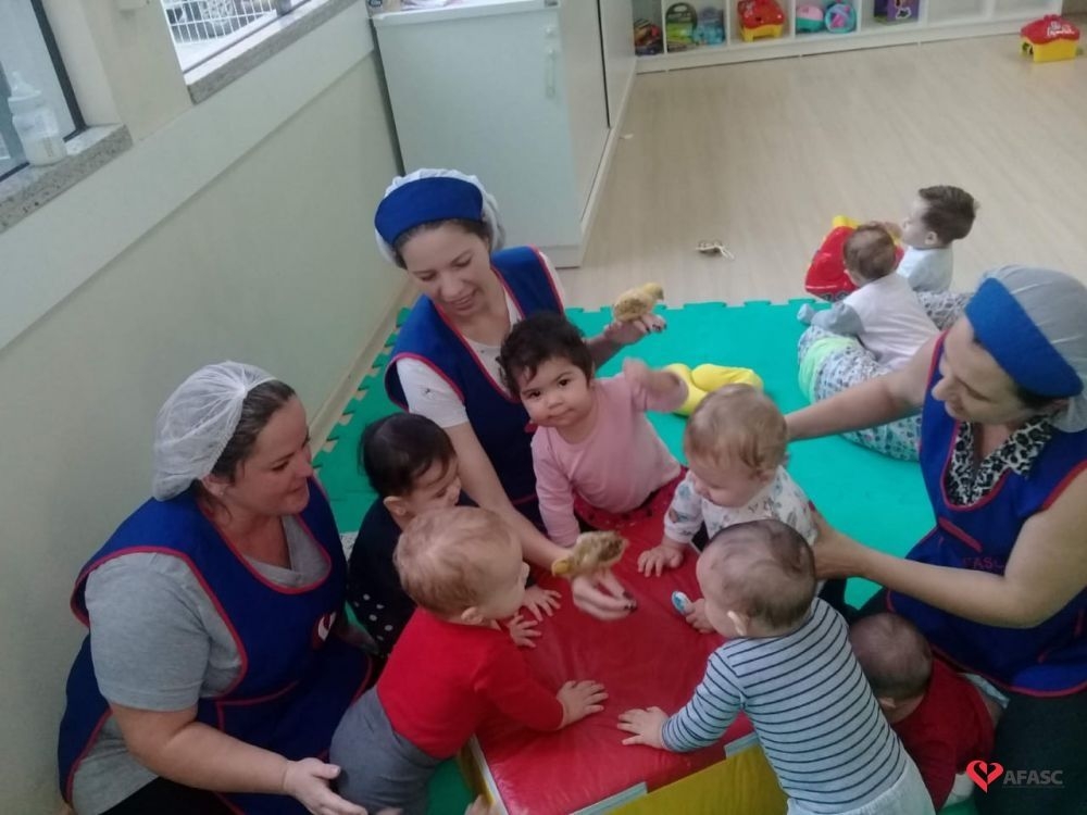 Estimular é a palavra chave para o desenvolvimento da criança rumo a aprendizagem, proporcionando e oferecendo condições e meios para as crianças se tornarem pensantes e capazes de adquirir sua própria identidade. Esses foram os objetivos que levaram as profissionais Denize Dias, Lisiane Ruchert, Suelen Firmino, Keli Damásio e Ana Paula Fortunato, do Grupo I do Centro de Educação Infantil (CEI) da Associação Feminina de Assistência Social de Criciúma (Afasc) Pequeno Polegar a realizarem as atividades de musicalização “Meu pintinho amarelinho” e a contação de história “Pintinho amarelinho fujão”.