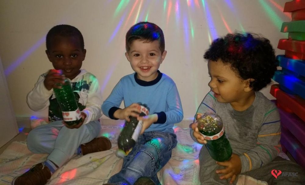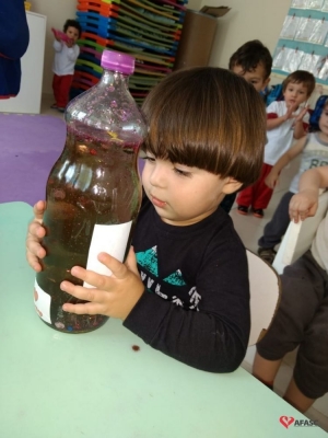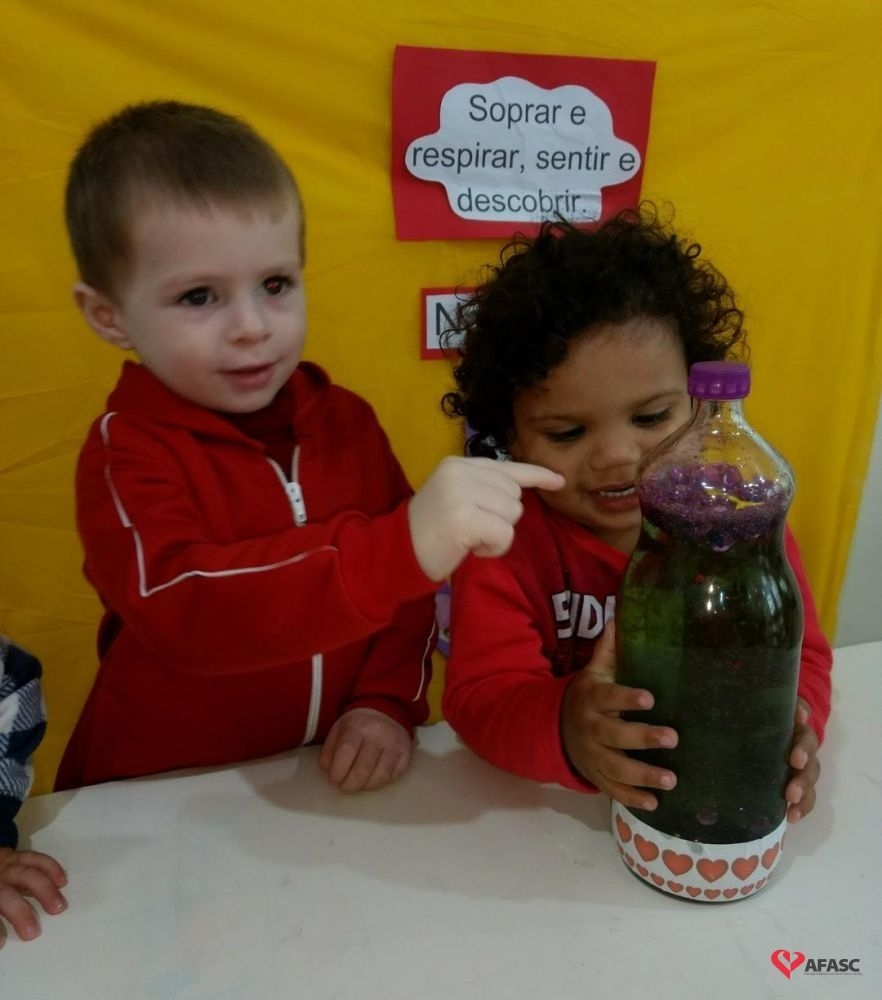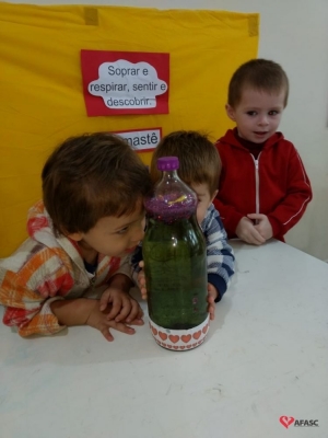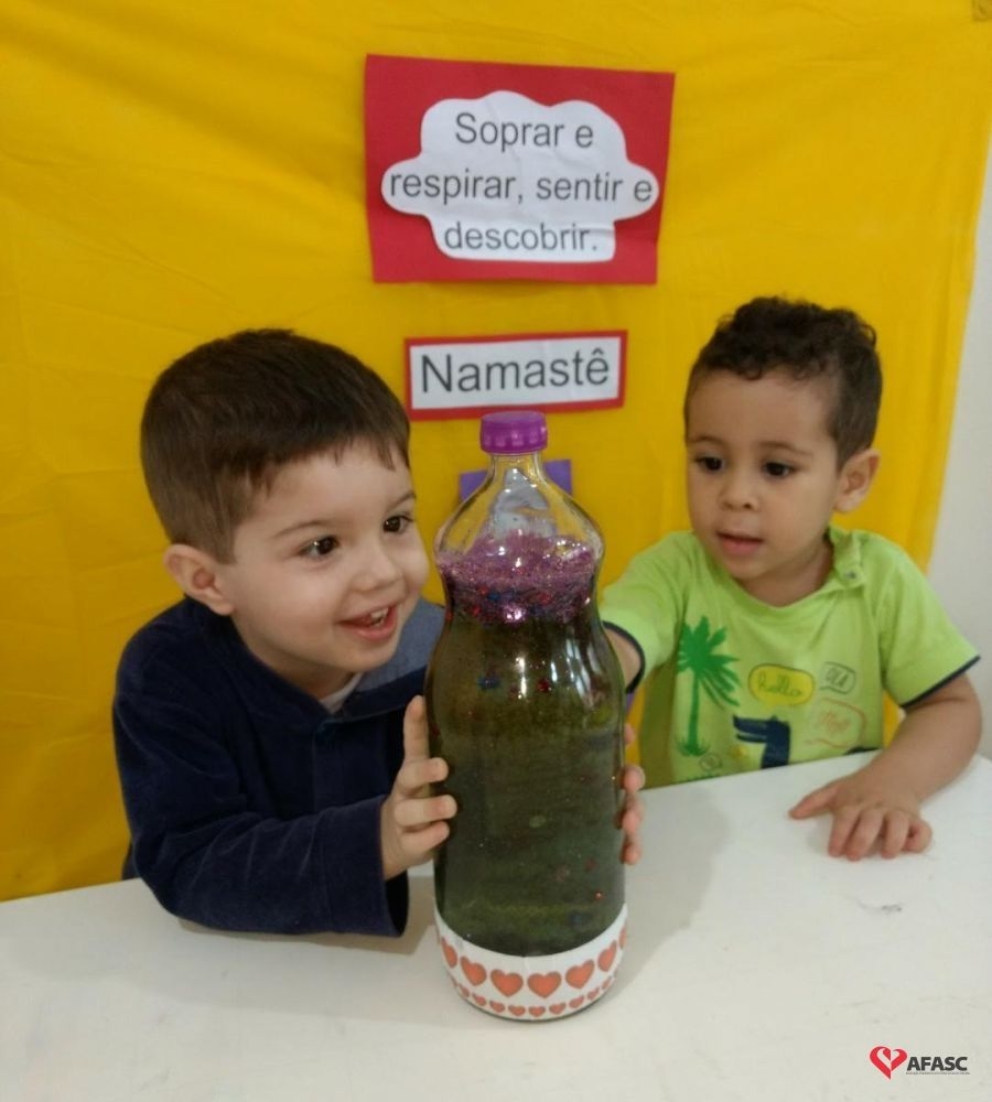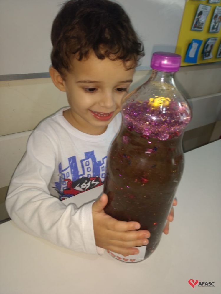 Entre as novas técnicas implementadas em sala de aula as crianças conheceram a “Garrafa da Calma”. As educadoras usaram garrafa com tinta colorida e muito gliter, que era movimentada pelas crianças. Com uma música suave de fundo, as educadoras Rosana Fogaça e Cintia Creaste, pediram para as crianças deixarem a garrafa ficar parada e observassem o movimento do gliter, que aos poucos ia se colocando no fundo da garrafa, trazendo calma para os pequenos.