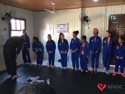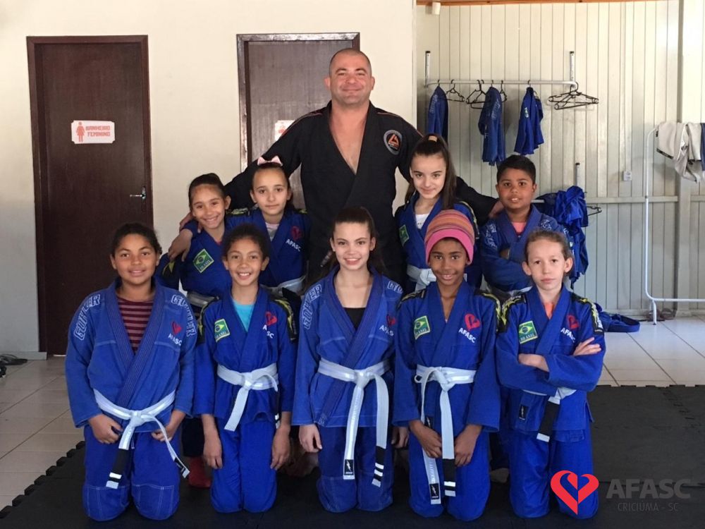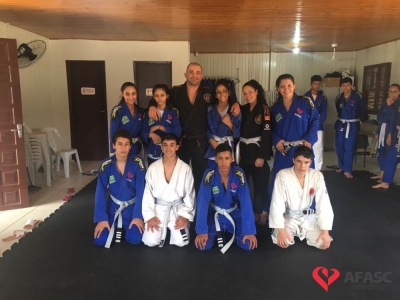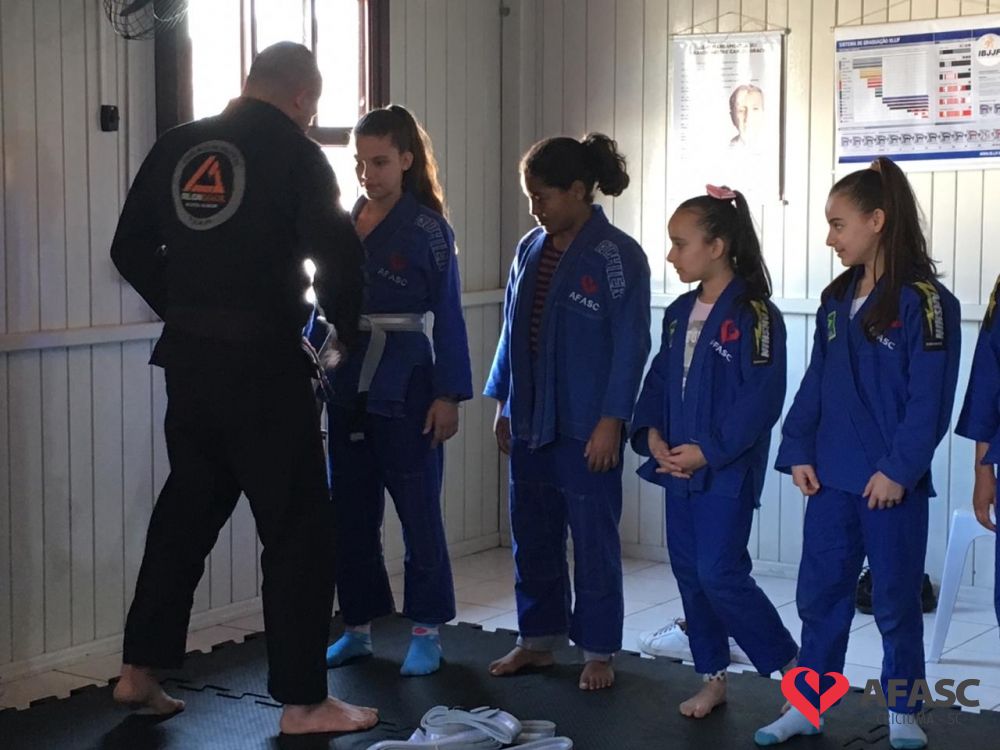 A nova graduação de faixas foi realizada pelo facilitador da oficina de Jiu Jitsu do SCFV de zero a 17 anos da Associação Feminina de Assistência Social de Criciúma (Afasc), Philipi Luis Pereira e pela orientadora social, Regina Guessi.