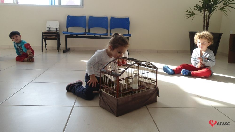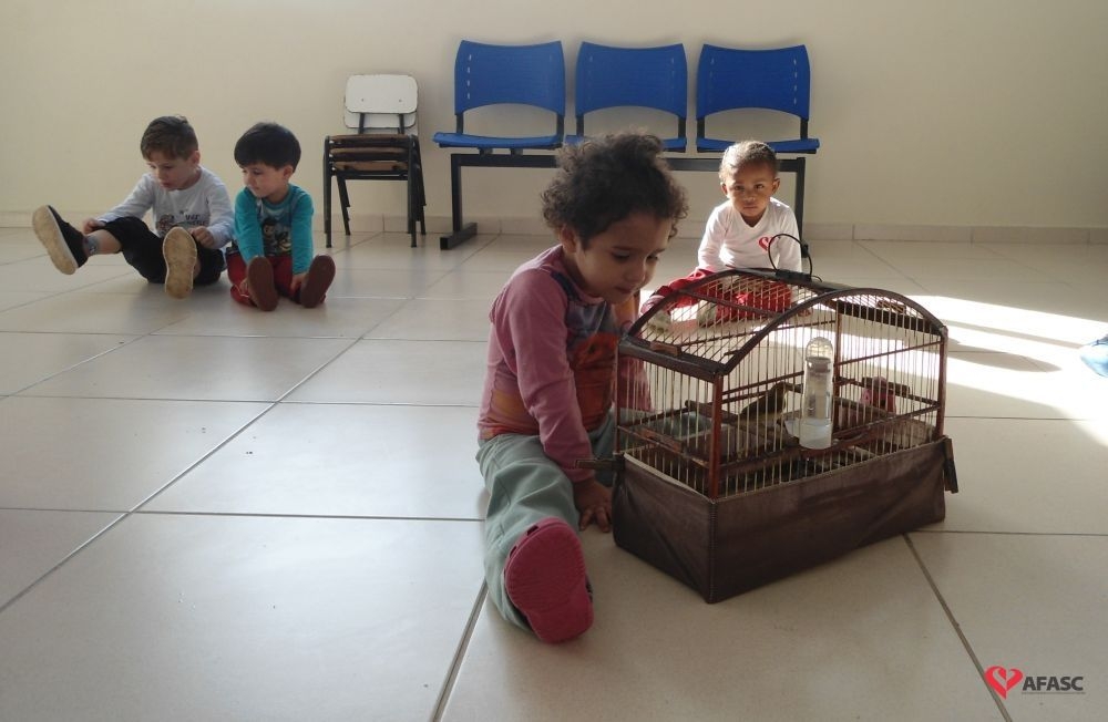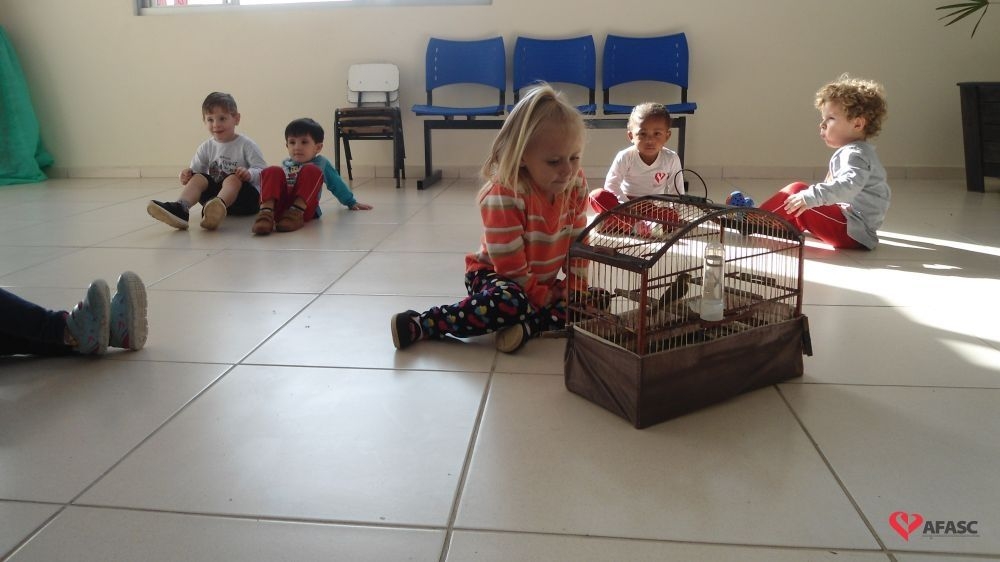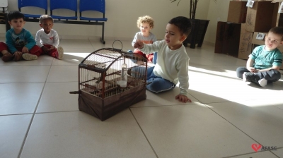 Desta vez, o animal estudado foi o passarinho, sendo que as professoras explicaram sobre como os ninhos são feitos e a importância de todos os animais serem livres, não vivendo em gaiolas.