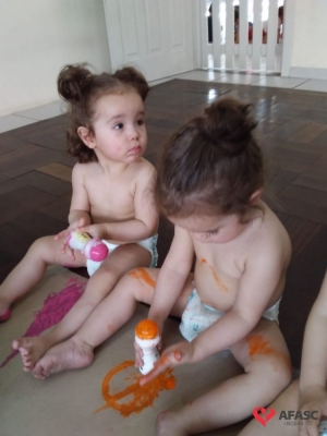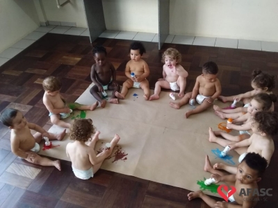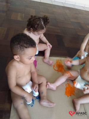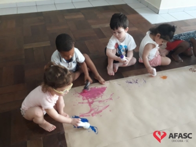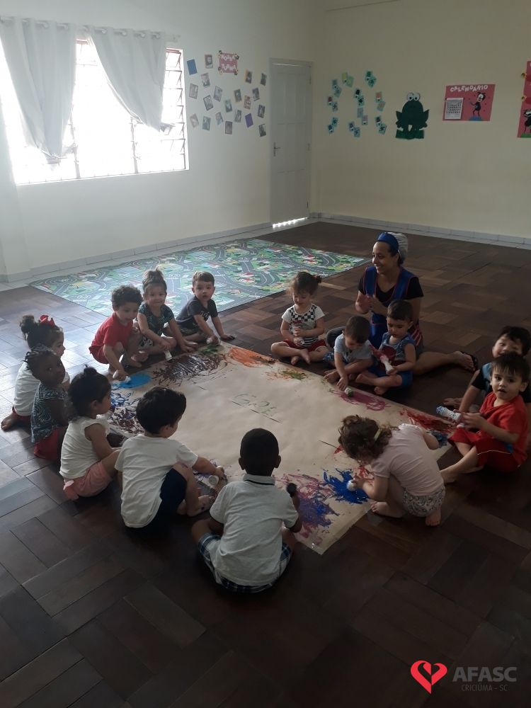 As professoras dos Andreza dos Santos, Iasmin Sene, Elineide Colombo e Maria Júlia Frasseto que atuam nos Grupos II A e E do Centro de Educação Infantil (CEI) da Associação Feminina de Assistência Social de Criciúma (Afasc) Professora Lapagesse, trouxeram para a sala de aula uma atividade muito criativa e colorida, o que transformou o dia das crianças em muita diversão. Utilizando rolons cheios de tintas e papel pardo, os pequenos deixaram seus registros.