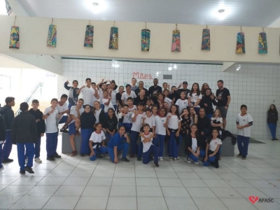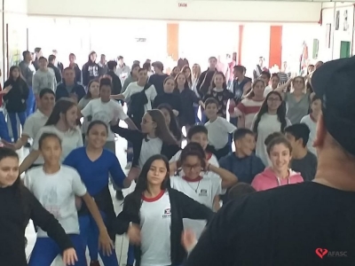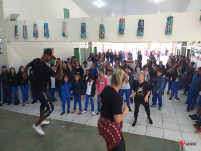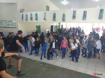 Profissionais do Programa da Associação Feminina de Assistência Social de Criciúma (Afasc) Ritmo e Saúde preparam um repertório especial para as crianças e adolescentes que estudam na Escola Municipal de Ensino Fundamental (E.M.E.F.) Filho do Mineiro. A equipe foi convidada para fazer o encerramento do projeto trimestral “Atividade Física e Alimentação Saudável”, nesta quarta-feira (15), e deu aula com vários ritmos musicais.