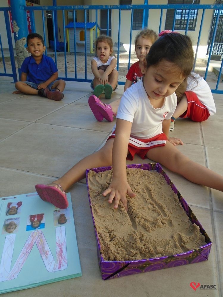 Para tornar a aprendizagem mais divertida, as educadoras fizeram atividades onde as crianças conheceram as letras de seu nome por meio de pintura e na caixa de areia.