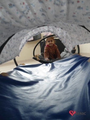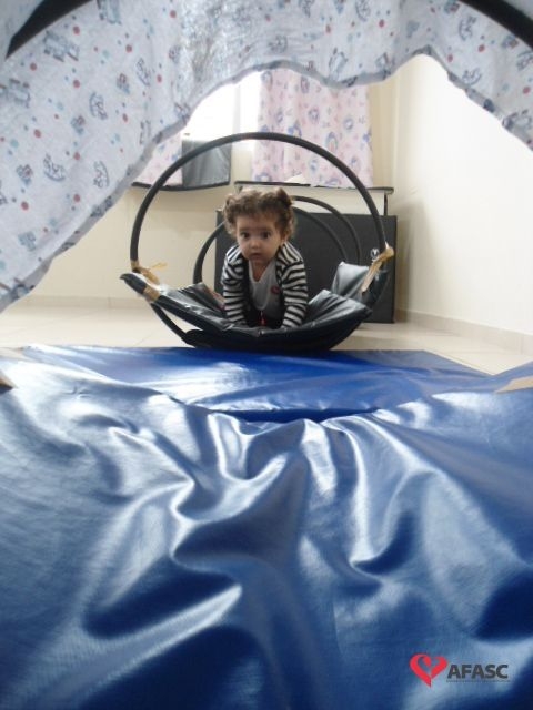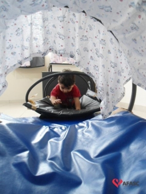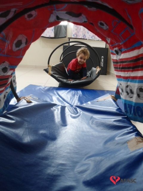 As professoras criaram um circuito de colchonetes e bambolês, onde havia um túnel e balanço.