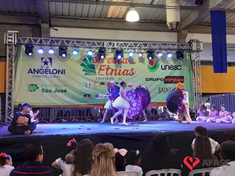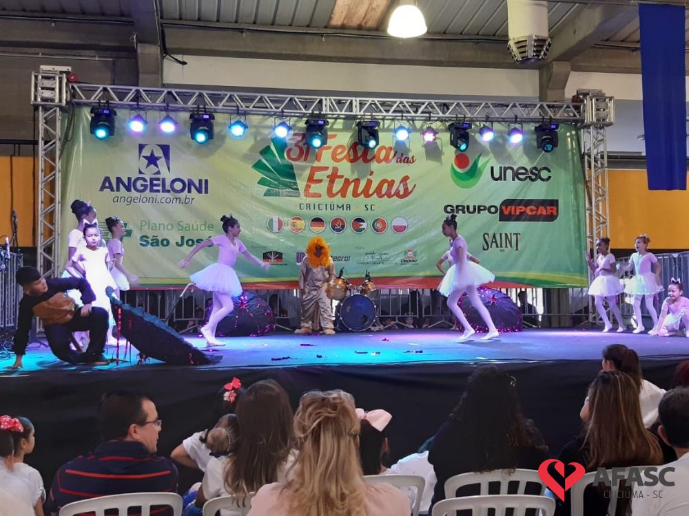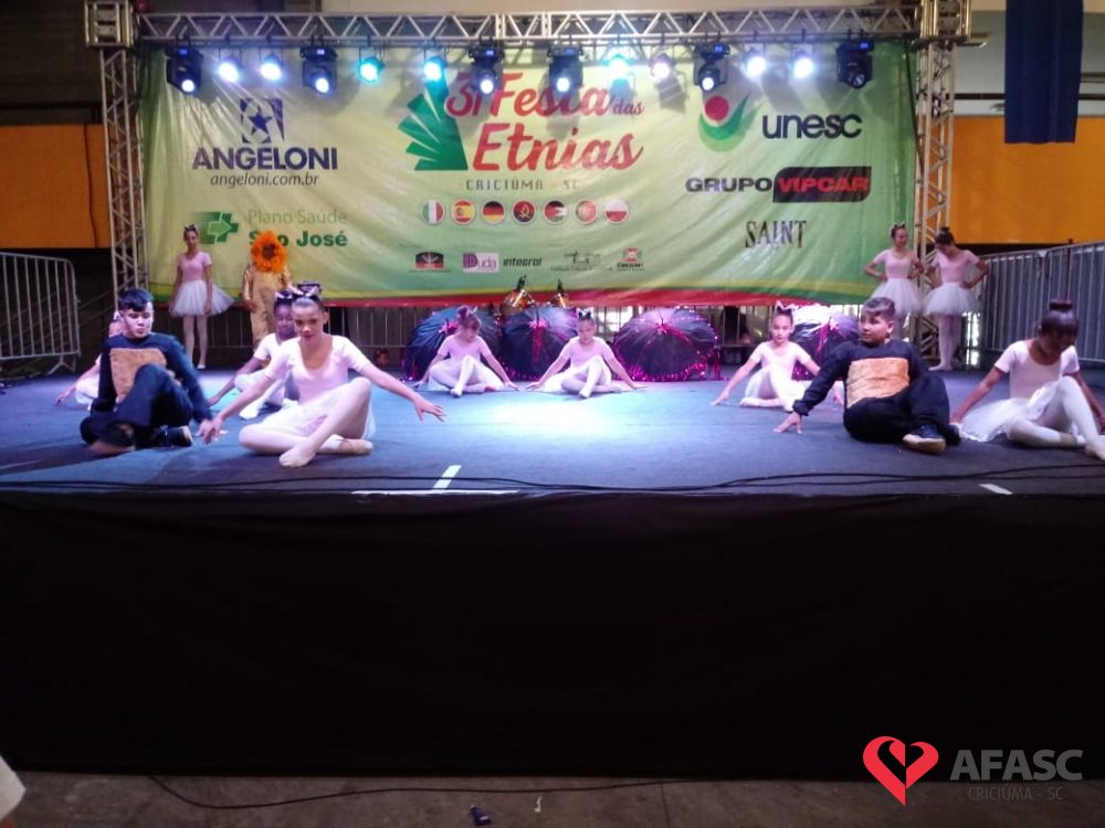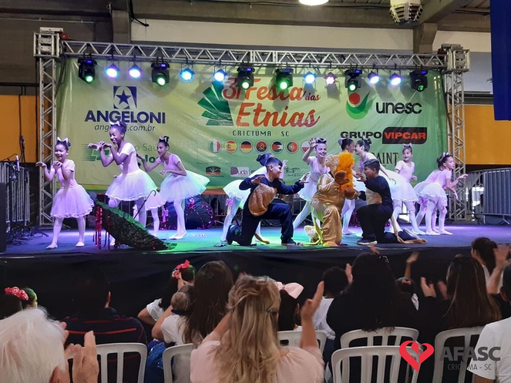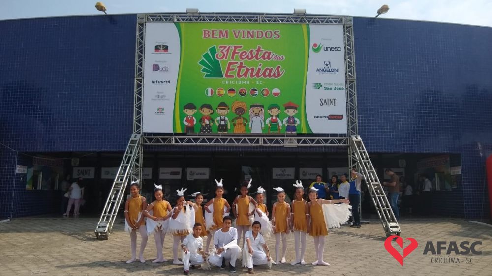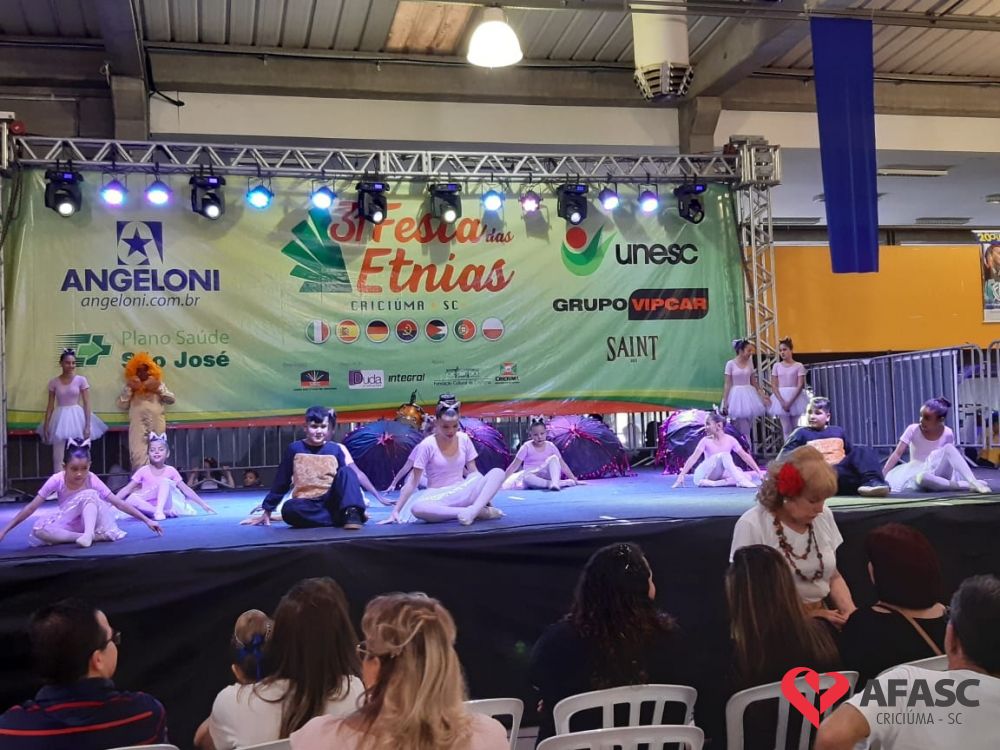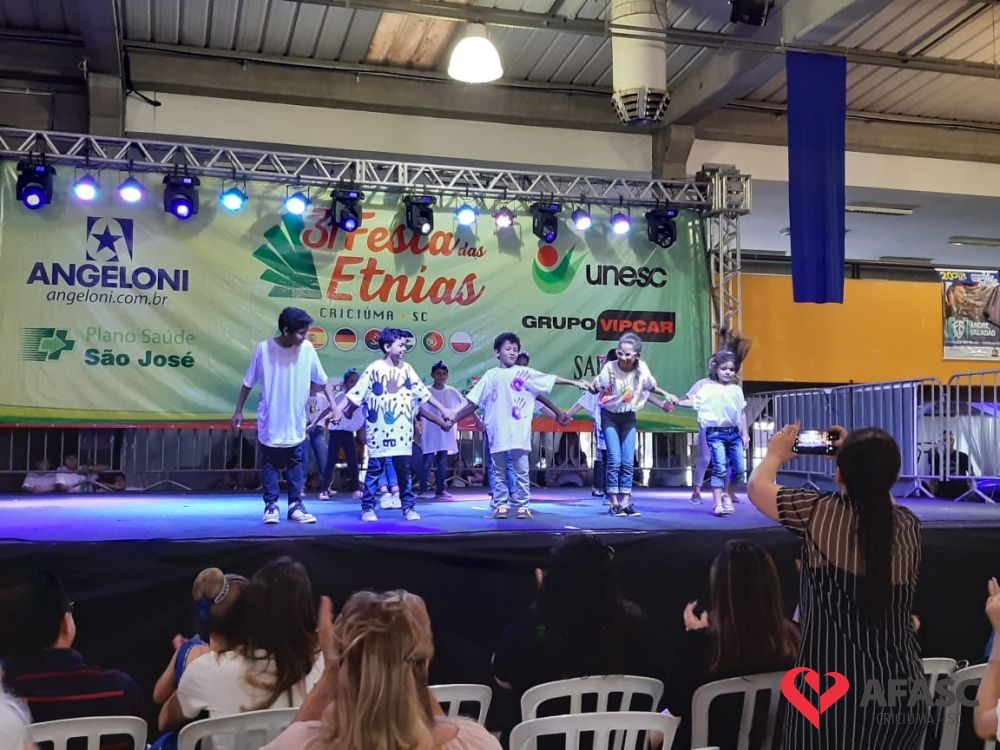 O Serviço de Convivência e Fortalecimento de Vínculos (SCFV) da Associação Feminina de Assistência Social de Criciúma (Afasc) participou da 31ª edição da Festa das Etnias na tarde de sábado (14), no Centro de Eventos José Ijair Conti. Na oportunidade crianças e adolescentes do SCFV Renascer, Vida Nova e Próspera, subiram ao palco para apresentações de ballet, danças urbanas, violão e flauta doce.