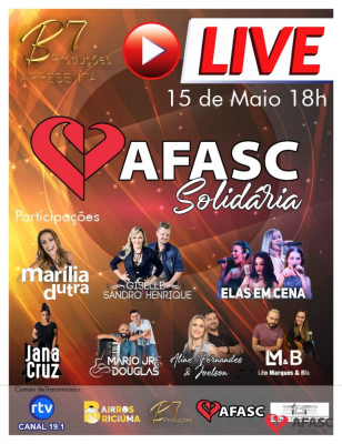 A Associação Feminina de Assistência Social de Criciúma (Afasc) e a B7 Produções estão preparando um grande evento, que irá animar as pessoas em suas casas, ao mesmo tempo em que busca ajuda para atender as famílias em situação de vulnerabilidade social da cidade. Com a colaboração de diversos parceiros, será realizada neste sábado (15) a partir das 18 horas, no palco do Teatro Elias Angeloni, a Live Afasc Solidária. O show virtual, traz o nome de grandes músicos regionais, que irão abrilhantar o evento beneficente. A live será transmitida através da página oficial do facebook da Afasc e na RTV Criciúma (canal 19.1)