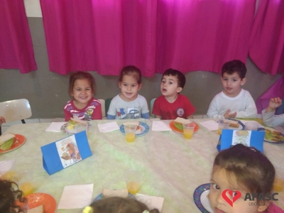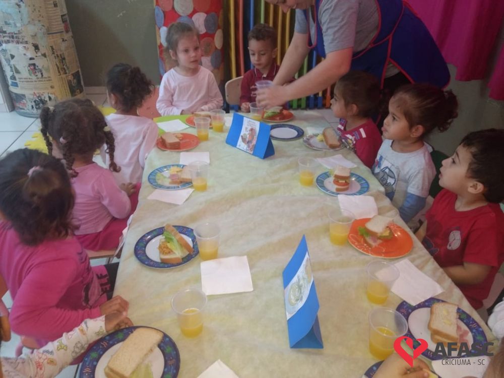 Para que as crianças pudessem entender melhor sobre alimentação, as educadoras contaram a história “O Sanduíche da Maricota”, que conta a história de uma galinha, que recebe diversas opiniões para montar seu lanche, mas no final, decide comer o que ela mesma havia pensado.