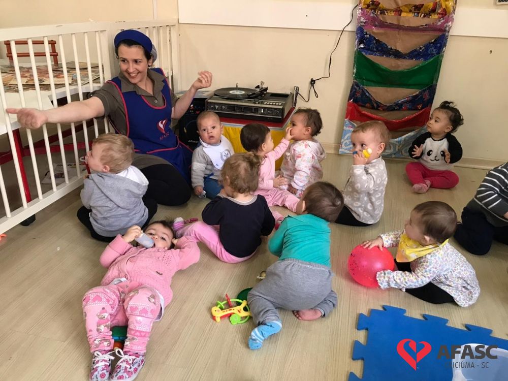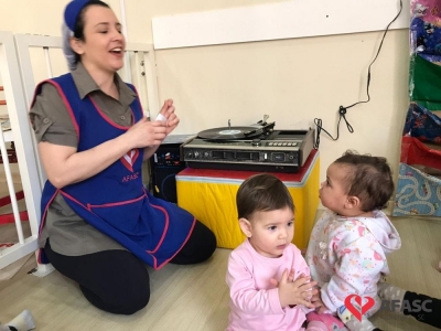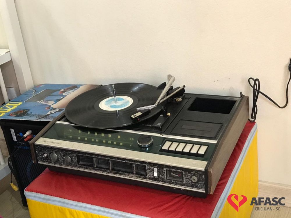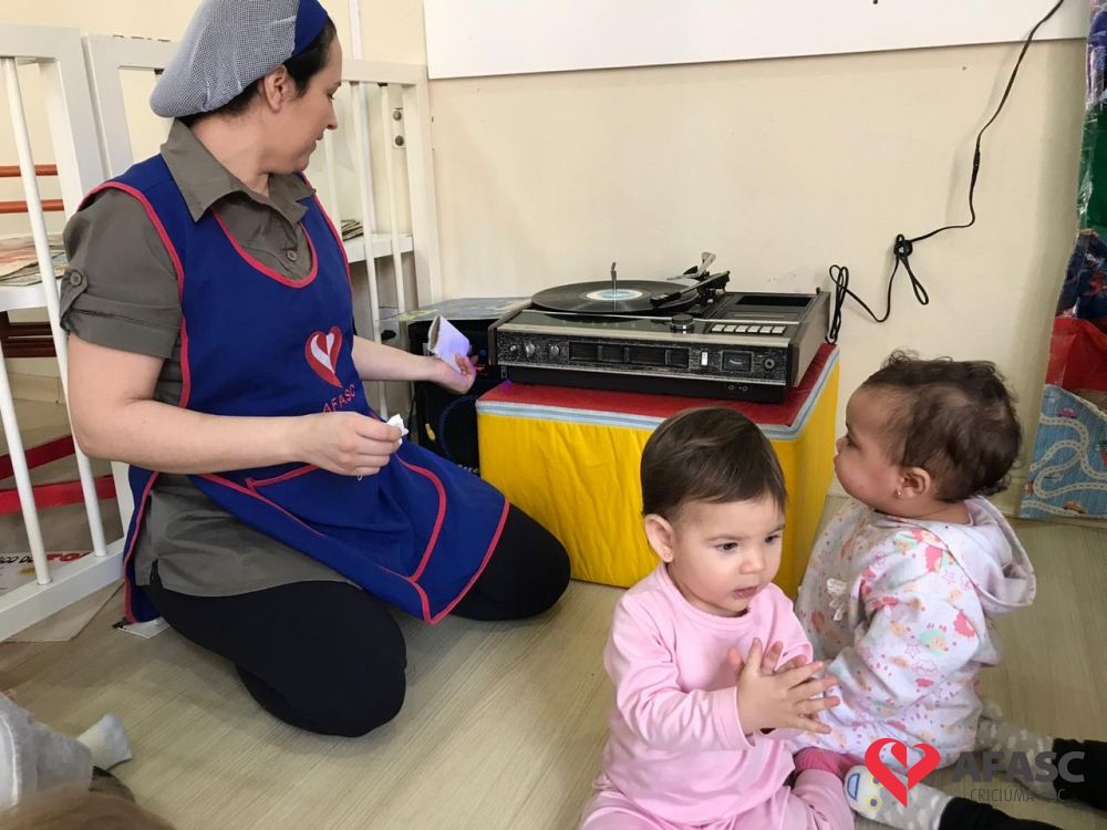 Com o intuito de desenvolver a coordenação motora global acompanhando movimentos e gestos, as professoras do Grupo I do Centro de Educação Infantil (CEI) da Associação Feminina de Assistência Social de Criciúma (Afasc) Pequeno Polegar, Denize Colombo, Najah Ibrahim, Suelen Fortuna, Lisiani Ruchert e Keli Damásio desenvolveram a atividade “Vitrola de vinil com cantigas antigas infantis”.